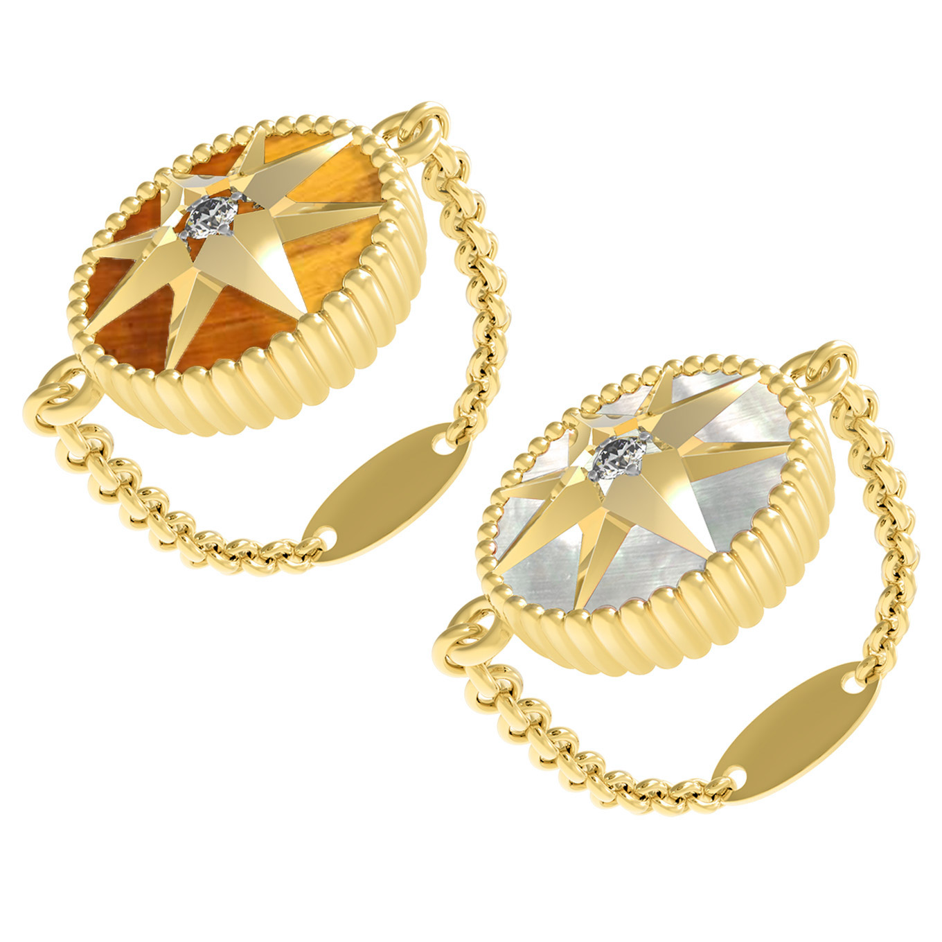 Кольцо из лимонного золота c фианитом, тигровым глазом и перламутром