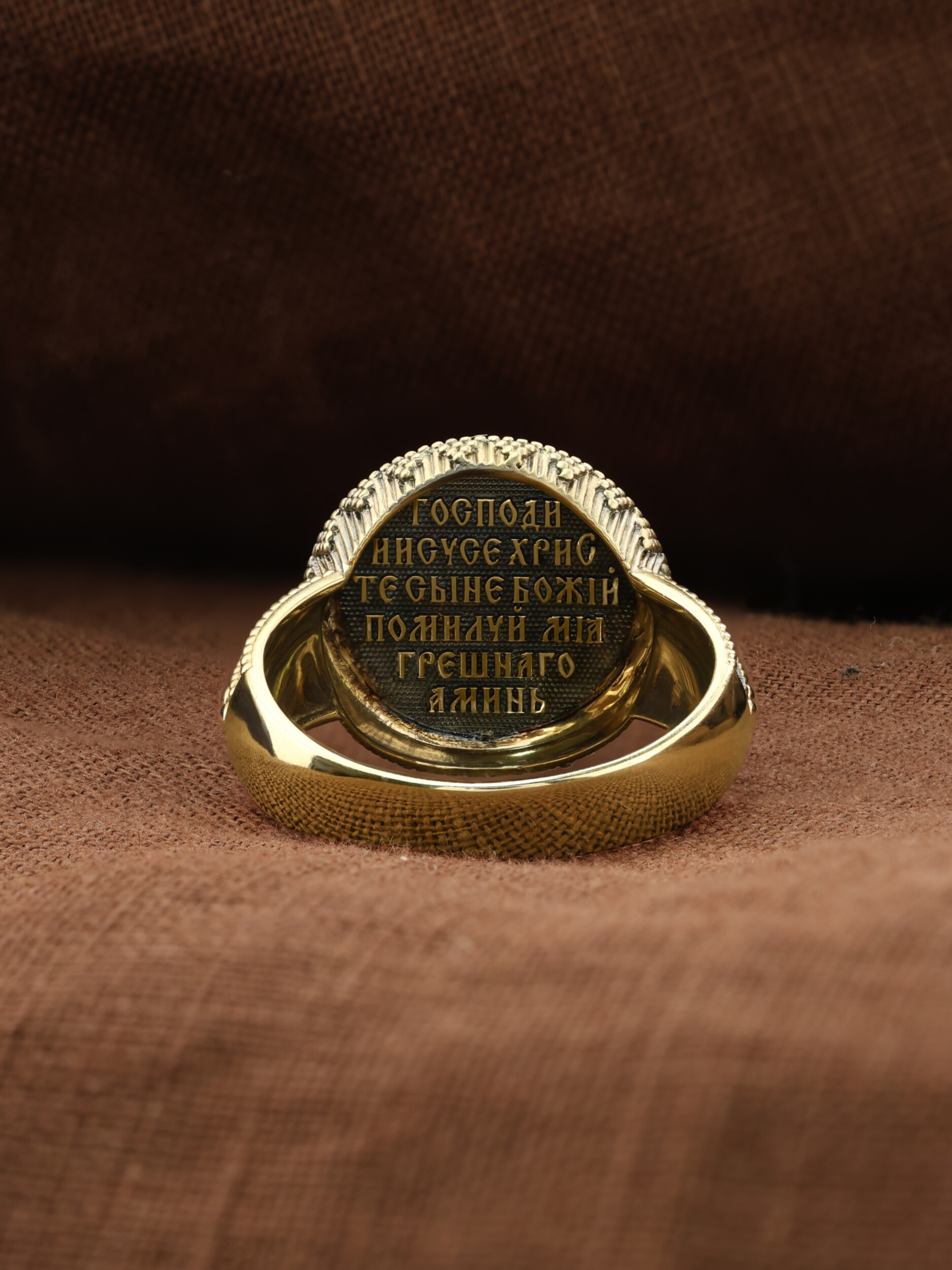 Кольцо «Господь Вседержитель» выполнено в древних христианских традициях. Господь Вседержитель или Пантократор (от греч. всевластный, всесильный). Он представлен как Царь Небесный и будущий Судия мира. Именование Иисуса «Вседержителем» указывает, с одной стороны, на Его Божественную природу: «Аз есмь Альфа и Омега, начало и конец, говорит Господь, Который есть и был и грядет, Вседержитель» (Откр. 1: 8). С другой стороны, такое именование связано и с человеческой природой Христа, искупившего крестной жертвой людские грехи и обновившего тем самым человеческую природу. Господь Иисусь Христос изображен фронтально огрудно. Главу Спасителя осеняет нимб, на нем угадывается крест. Крест символизирует голгофскую жертву Спасителя. По греческой традиции, на нимбе написаны буквы Омега, Омикрон, Ню — вместе они обозначают слово Сущий, одно из имен и характеристику Бога, согласно Священному Писанию. Правой рукой Он благословляет, а левой держит Евангелие — благую весть, принесенную Христом всему миру. Также означает она тот новый мир, который будет сотворен Богом после второго пришествия Христа. Символизирует и Книгу Жизни, где записаны имена всех, возлюбивших Бога. Всемогущий Бог предстает здесь не как обличающий судья, а как милостивый отец, ждущий возвращения блудных детей.