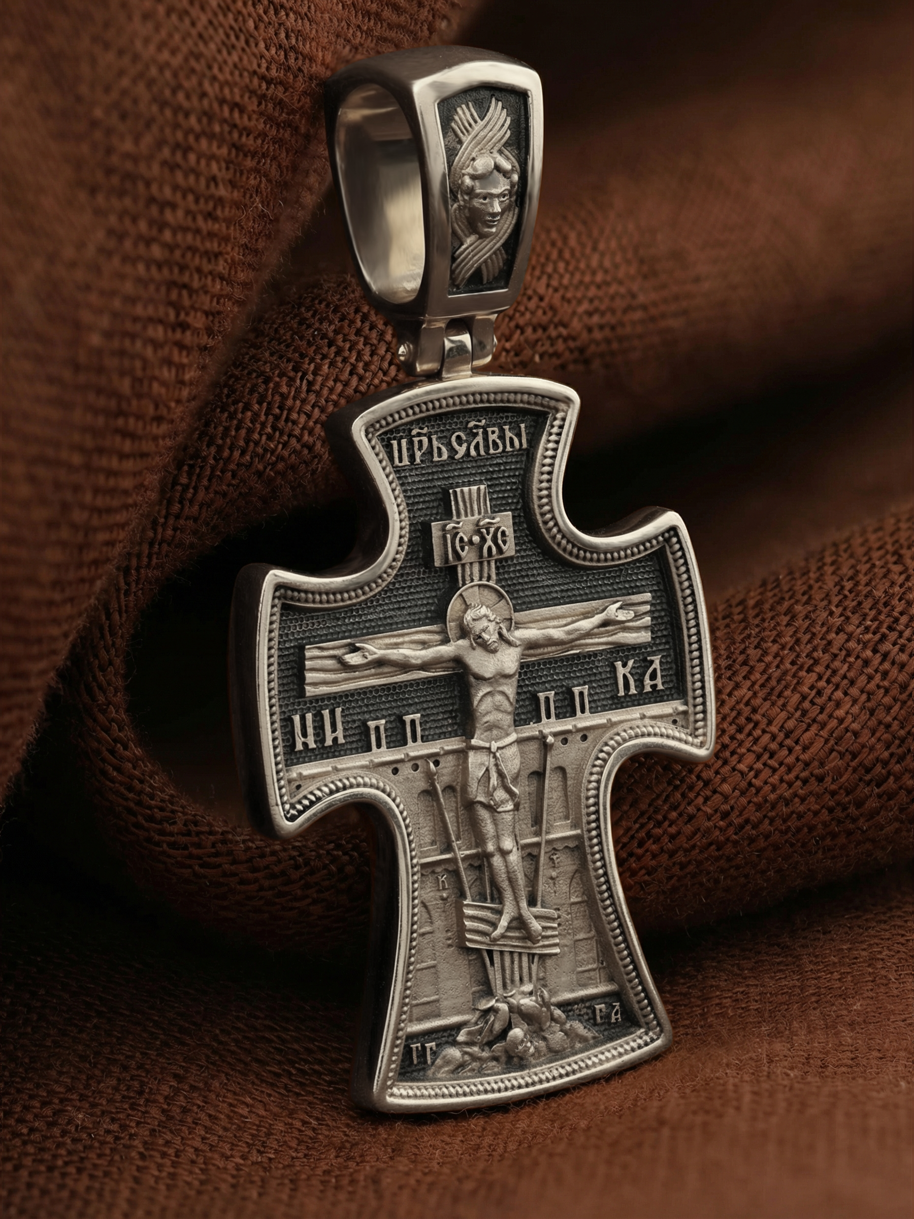Оборотную сторону креста возглавляет икона святителя Николая Чудотворца, которого еще называют Николай Угодник за то, что он угодил своей жизнью Богу. Николай Чудотворец, помощник в делах, покровитель учащихся, утешитель обиженных. Также Святитель Николай Чудотворец известен своими молитвами за путешественников, когда непрестанный ветер и бушующие волны утихают и корабль заходит в спокойную гавань. На кулонном кольце изображен Спас Нерукотворный — Символ вочеловечившегося Божества и четырехкрылый Херувим.