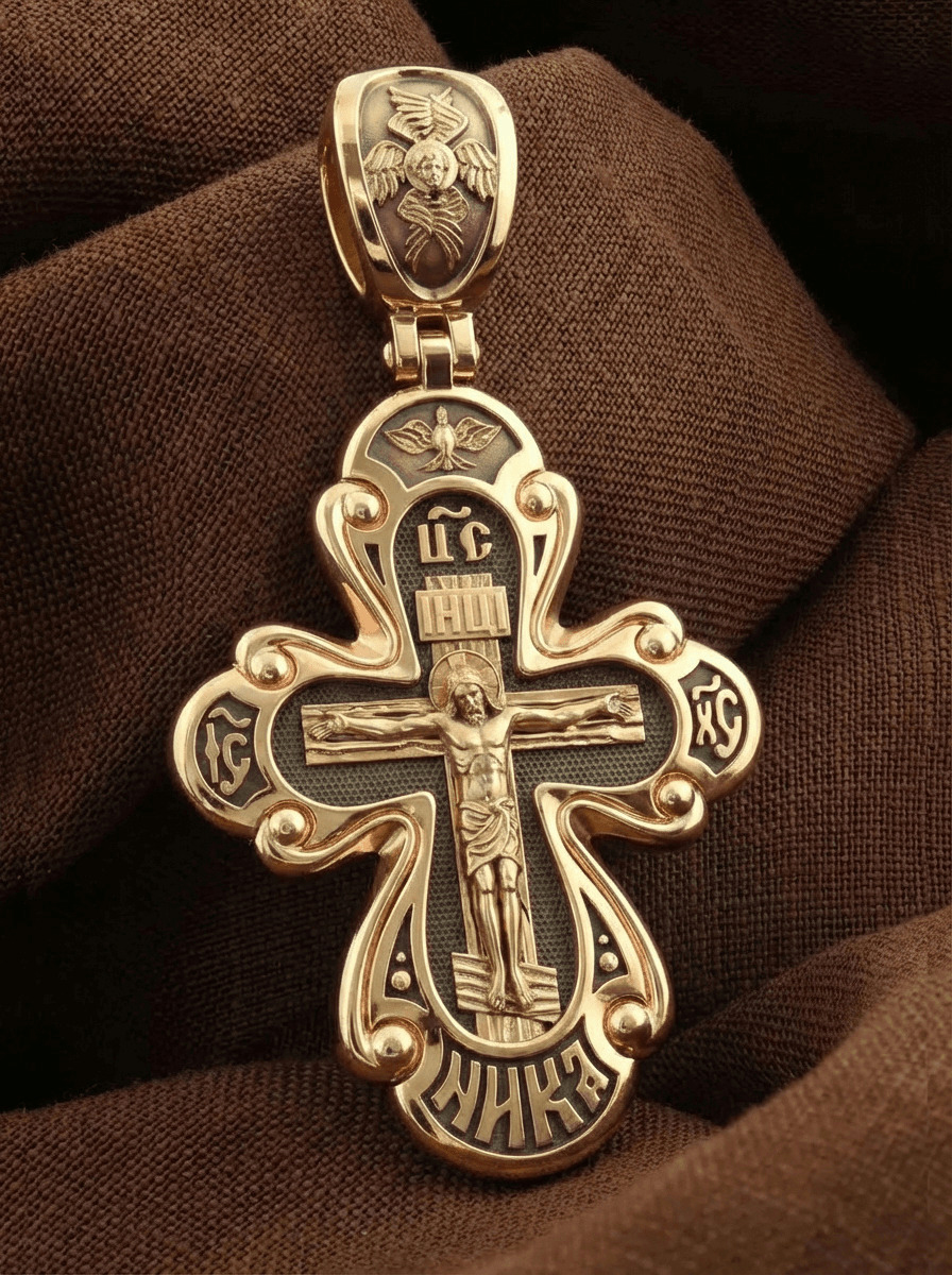 На лицевой стороне креста изображено Распятие Иисуса Христа. Господь представлен свободно покоящимся на кресте с простертыми руками и как бы обнимающим всю Вселенную. Он — Спаситель, искупивший грехи мира, «поправший смертию смерть» и призывающий к Себе «все концы земли». Поэтому рядом с Его образом помещены слова — «НИКА» и «Царь Славы». Эти слова характеризуют Господа как Великого Архиерея, победителя смерти. Верхняя перекладина символизирует титло — табличку, на которой, согласно Евангелию, было начертано: Иисус Назорей Царь Иудейский (IНЦI). Также Распятие сопровождается надписями, олицетворяющими Христа. Это святое имя Христа «IC» (Иисус) «ХС» (Христос), и словосочетание «СЫН БОЖИЙ».