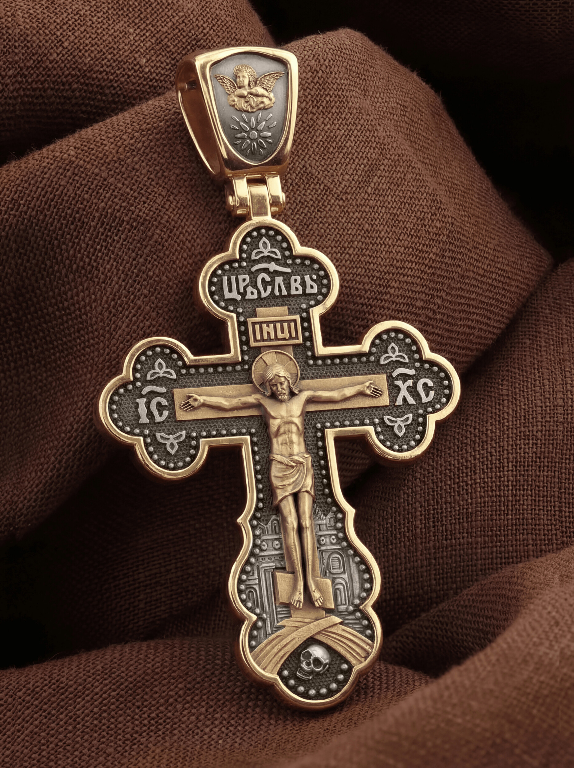 На лицевой стороне креста изображено Распятие, потому что это орудие казни Иисус Христос сделал орудием победы над грехом и смертью. Своими страданиями Он искупил грехи человечества, умерев и сошествовав во ад, победил сатану, освободил души праведников от вечной смерти и открыл им небесные врата рая. Жертва Христа сделала возможным спасение для каждого человека. На православном кресте Христос не умирает, а свободно простирает руки, ладони Иисуса открыты, будто он хочет обнять все человечество, даря им свою любовь и открывая путь к вечной жизни. Над титлом видим слова «ЦРЬ СЛВЫ» — Царь Славы. Верхняя перекладина символизирует собой табличку с надписью «IHЦI» — Иисус Назарянин Царь Иудейский. Возле перекладины пишется сокращенно имя Спасителя «IC XC» — Иисус Христос. Возвышение, на котором стоит Крест, символизирует гору Голгофу, на которой произошло Распятие. У подножия Креста изображают прах Адама, обозначенный черепом.