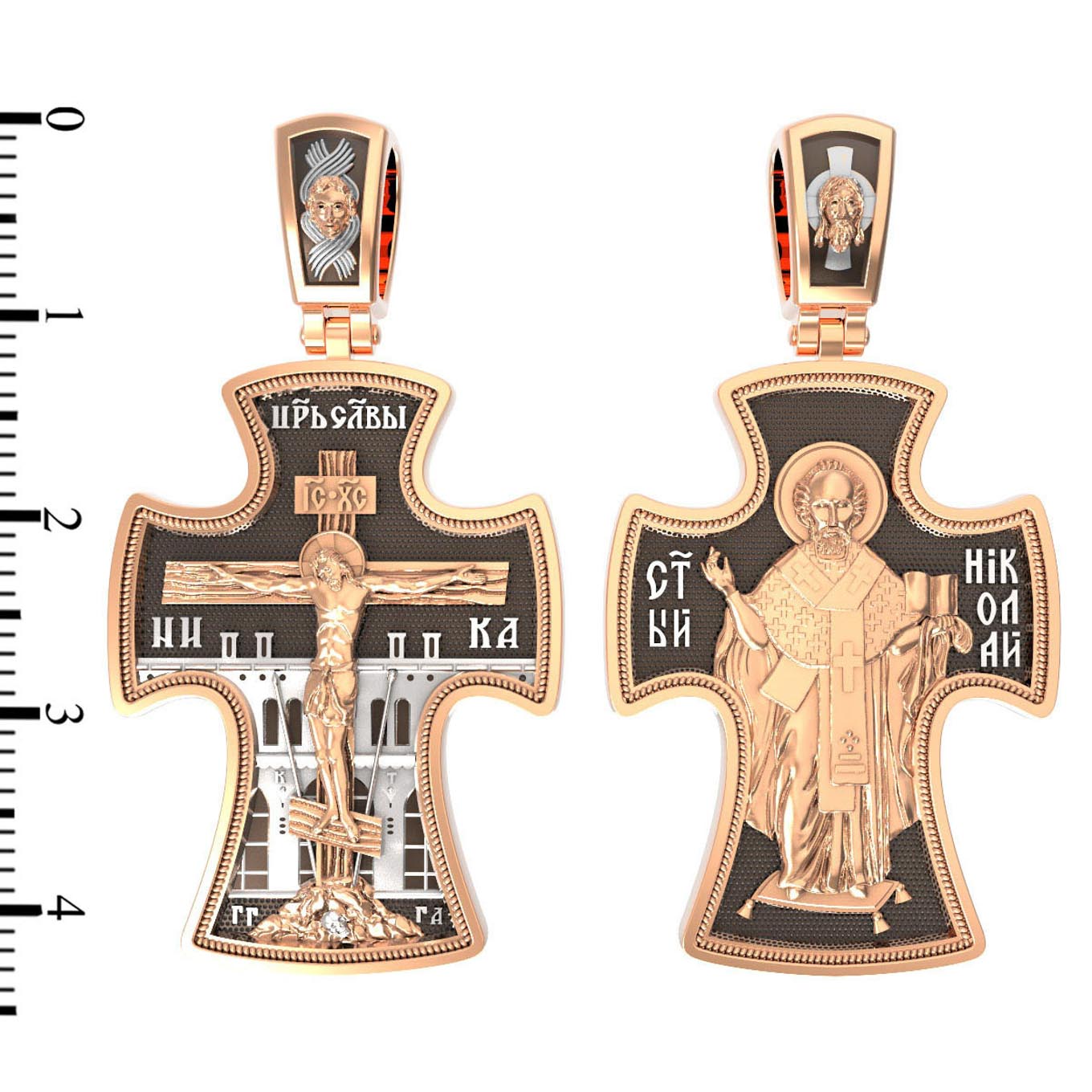Оборотную сторону креста возглавляет икона святителя Николая Чудотворца, которого еще называют Николай Угодник за то, что он угодил своей жизнью Богу. Николай Чудотворец, помощник в делах, покровитель учащихся, утешитель обиженных. Также Святитель Николай Чудотворец известен своими молитвами за путешественников, когда непрестанный ветер и бушующие волны утихают и корабль заходит в спокойную гавань. На кулонном кольце изображен Спас Нерукотворный — Символ вочеловечившегося Божества и четырехкрылый Херувим.