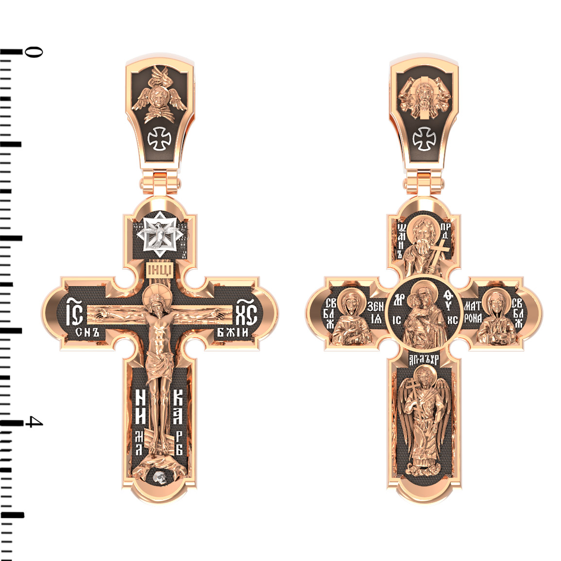 На кресте внизу изображен Ангел Хранитель, слева — Святая Блаженная Ксения, справа — Святая Блаженная Матрона, вверху — пророк, почитающийся в христианстве, Предтеча Господень Иоанн Креститель. На кулонном кольце помещено изображение Спаса Нерукотворного — образ Спасителя, который Он запечатлел на плате и передал для исцеления больному проказой царю Эдессы. Ему придается победное и защитное значение.