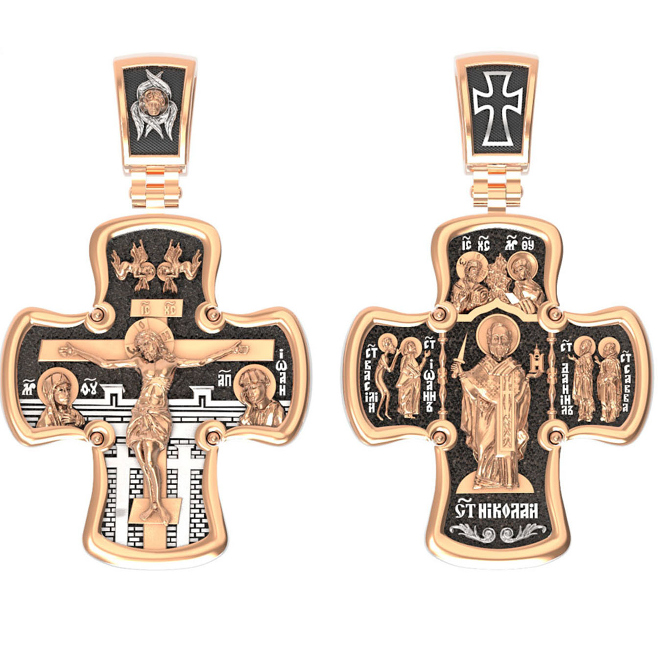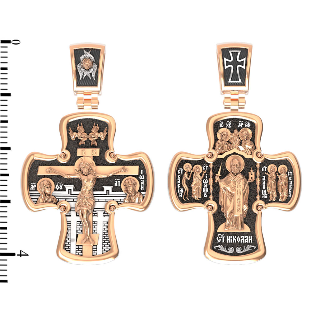 Лицевая сторона креста по канону посвящена Господу Иисусу Христу. Чаще всего на нательных крестах изображается Распятие, которое символизирует победу над грехом и смертью. Своими страданиями Господь искупил грехи человечества: умерев и сошествовав во ад, Он победил дьявола, освободил души праведников от вечной смерти и открыл им Небесные врата рая. Жертва Христа сделала возможным спасение для каждого человека. Поэтому на православных крестах Господь изображается не страдающим, а словно возносящимся и обнимающим весь мир. Он — Спаситель человечества, поправший смертию смерть и призывающий к Себе «все концы земли» (Ис. 45, 22). С двух сторон от Христа изображаются Его Мать, Пресвятая Богородица, и любимый ученик, апостол Иоанн Богослов. Они стояли у Креста неотлучно до самого конца, пока Господь не предал дух Свой Небесному Отцу. Позади — Иерусалимская стена. На иконах она обозначает место казни и символизирует Небесный Иерусалим, путь в который открылся для человечества через Голгофу.