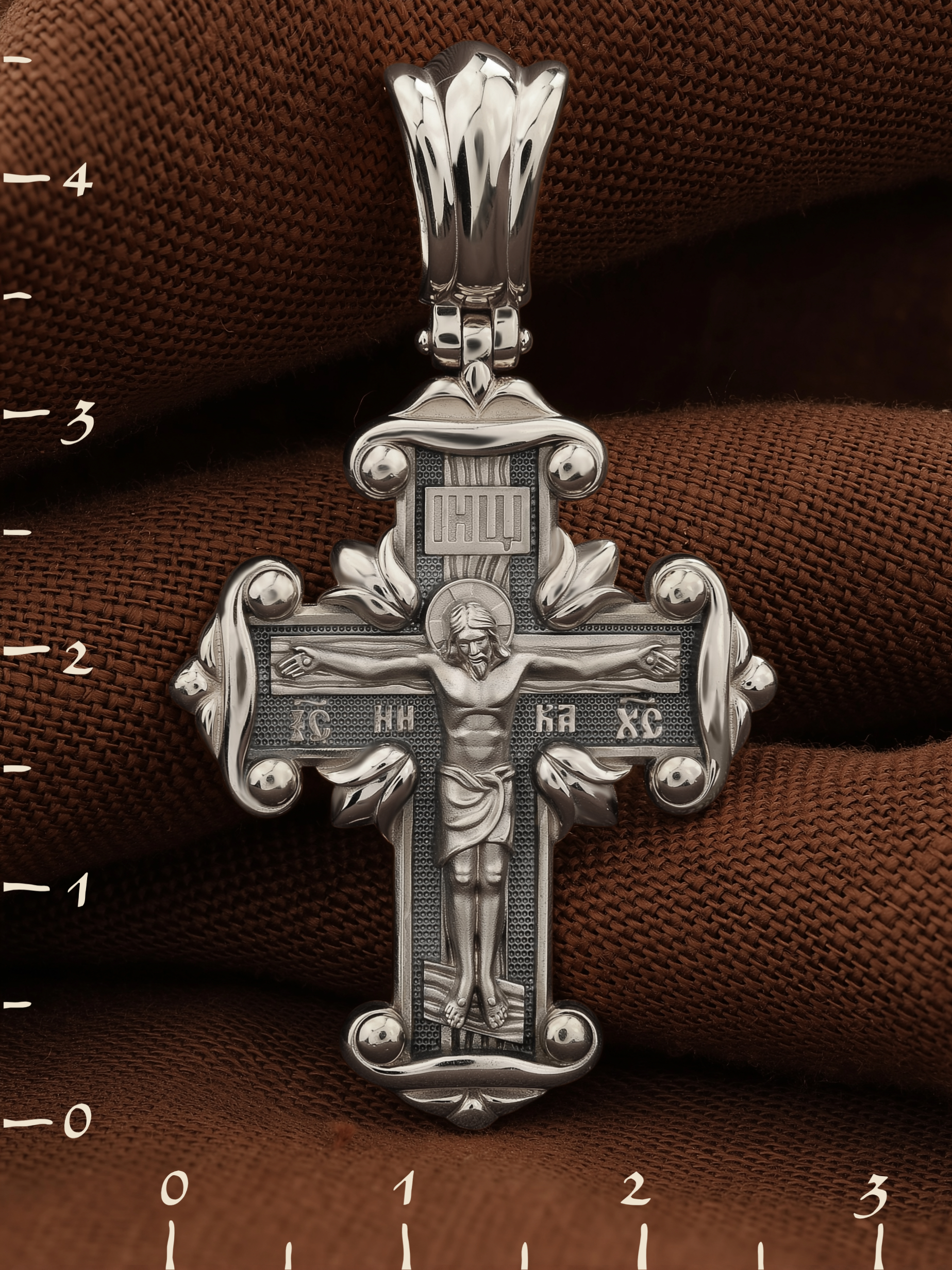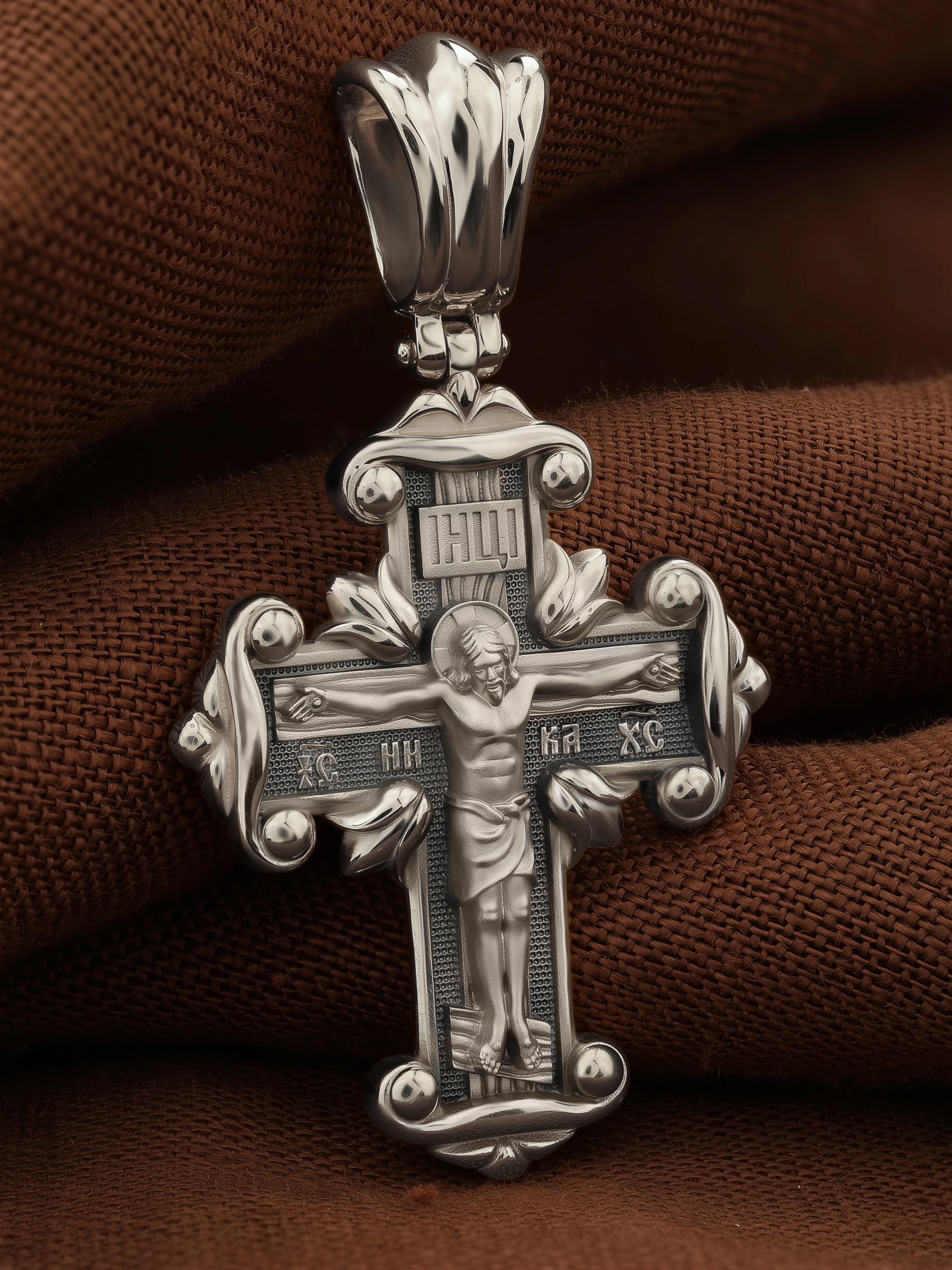 На лицевой стороне креста изображено Распятие Господа и Спасителя нашего Иисуса Христа, отдавшего Себя на смерть, для искупления грехов мира. Крест является символом жертвенной любви Всеблагого Бога к падшим людям, всепобеждающим духовным оружием христиан, основанием и средоточием церковной жизни. Господь сказал: кто хочет идти за Мною, отвергнись себя, и возьми крест свой, и следуй за Мною. (Мк. 8: 34). На верхней табличке, выше головы Иисуса, расположена надпись, составленная Понтием Пилатом — «IНЦI». Она означает «Иисус Назорей, Царь Иудейский». Надпись «IC» «ХC», означает Иисус Христос, помещается на разных сторонах поперечной перекладины креста. Рядом — слово «НИКА», что означает «победитель». На православном кресте Христос не умирает, а свободно простирает руки, ладони Иисуса открыты, будто он хочет обнять все человечество, даря им свою любовь и открывая путь к вечной жизни.