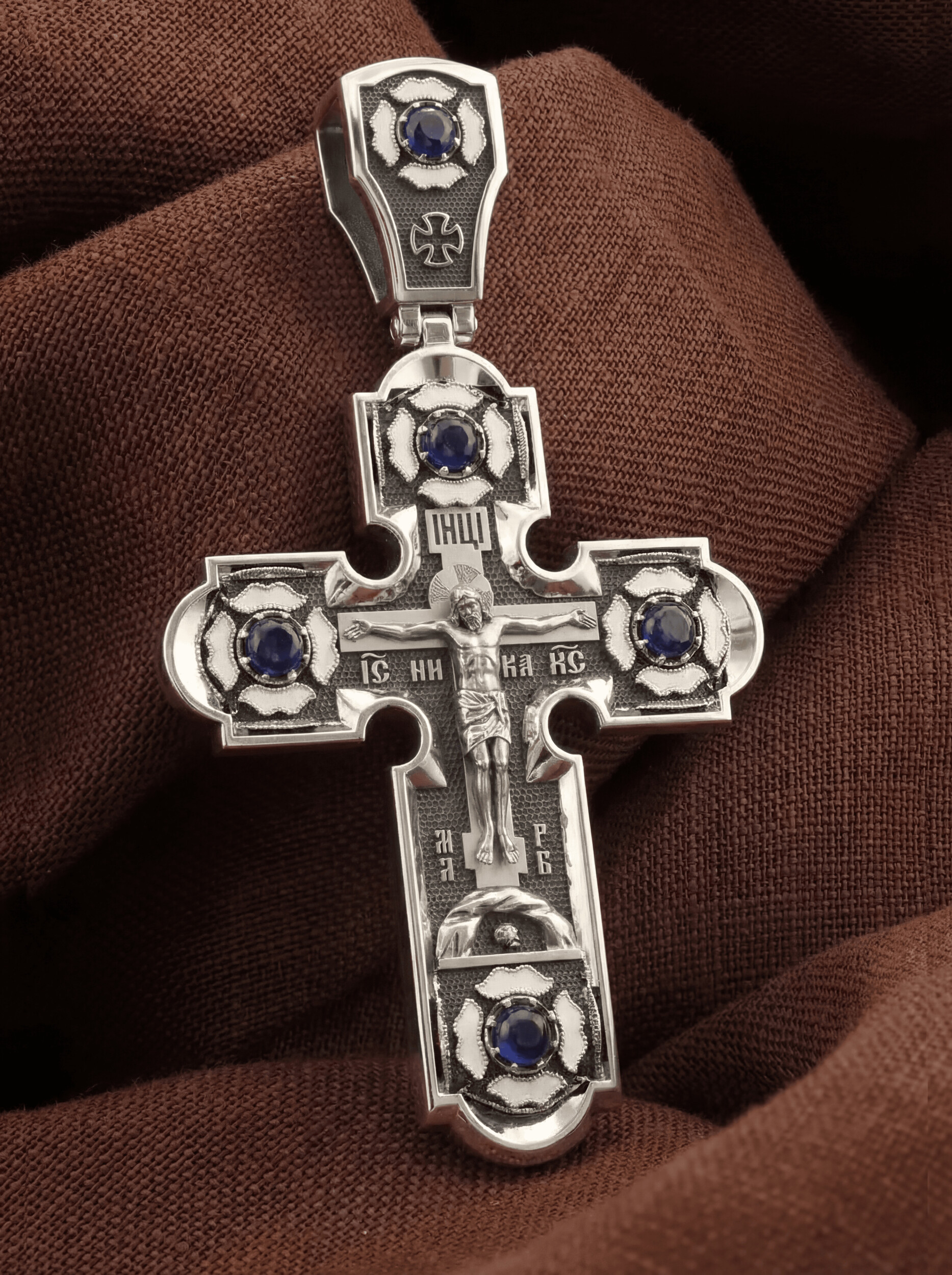 На лицевой стороне креста изображено Распятие Господа и Спасителя нашего Иисуса Христа. Христос, подвергнутый на кресте мучительной казни, своими страданиями искупил нас от древнего греха и даровал нам жизнь вечную. На верхней табличке, выше головы Иисуса, расположена надпись, составленная Понтием Пилатом — «IНЦI». Она означает «Иисус Назорей, Царь Иудейский». Надпись «IС» « ХС» означает Иисус Христос и слово «НИКА», что означает «победитель», помещаются на разных сторонах поперечной перекладины креста. В нижней части креста находится надпись «МЛРБ» — «место лобное рай бысть» означает, что место лобное стало раем. Крест стоит на горе камней, символизирующих Голгофу. Под подножием Креста изображена покоящаяся голова (череп) Адама, грехи которого Христос омыл Своею Кровью. Христос в Своей Божественной любви, над которой смерть не властна и которая, страдая, и не страдает в обычном смысле, простирает к людям со Креста Свои объятия, в которые призывается и привлекается весь мир.