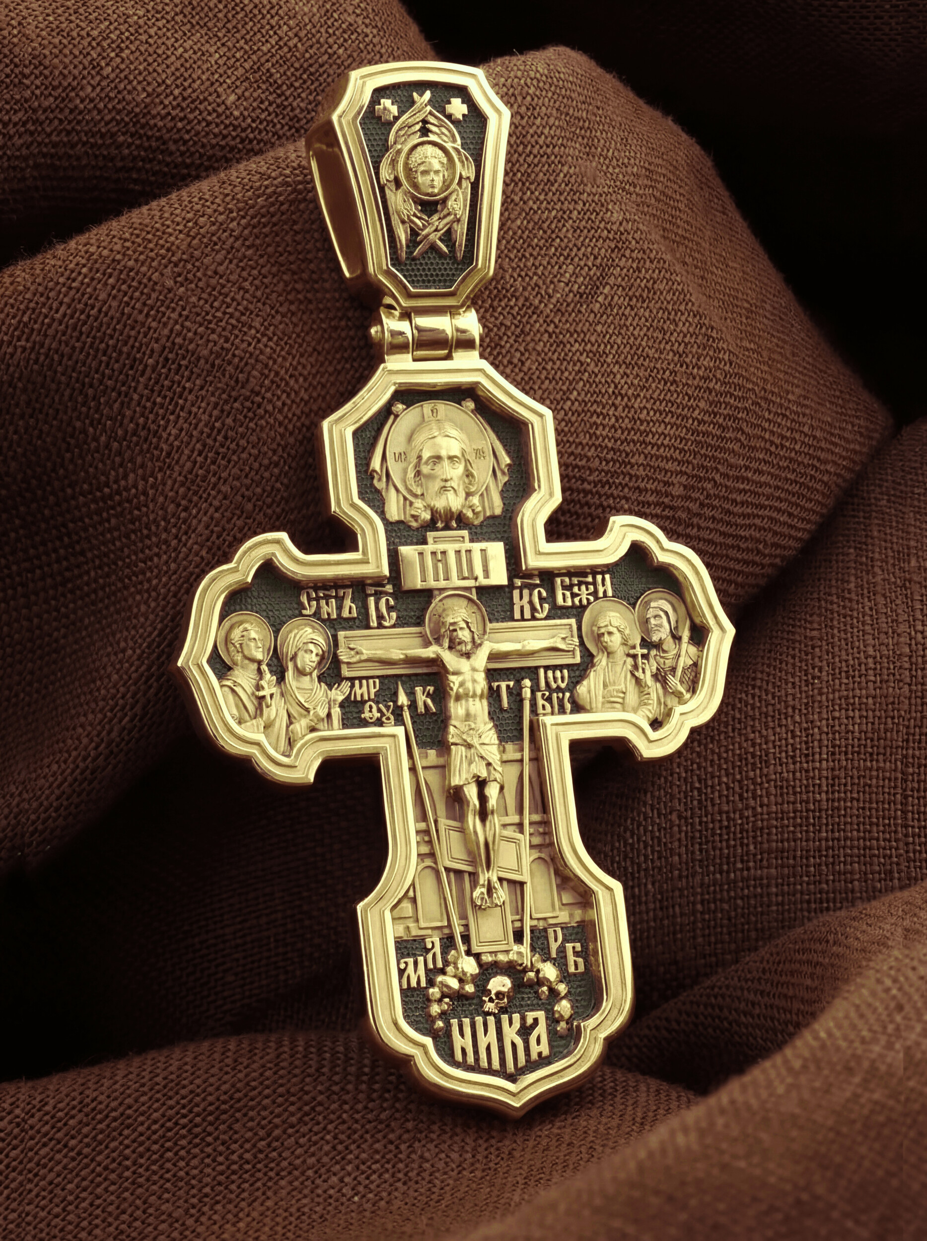 На лицевой стороне креста изображено Распятие Господа и Спасителя нашего Иисуса Христа. Крест- символ спасения и искупления рода человеческого, знамение победы над смертью и адом. Иисус Христос, как искупительная жертва освобождения человечества от власти греха, умер крестной смертью и в третий день воскрес. На верхней табличке, выше головы Иисуса, расположена надпись, составленная Понтием Пилатом — «IНЦI». Она означает «Иисус Назорей, Царь Иудейский». Надпись «IС» « ХС» означает Иисус Христос и помещается на разных сторонах поперечной (большой) перекладины креста. Рядом расположена надпись «Сын Божий». Выше Распятия изображен Нерукотворный образ Господа и Спасителя нашего Иисуса Христа. Слева от Распятия — Пресвятая Богородица и святая мироносица Мария Магдалина с крестом в руке. Справа — апостол и евангелист Иоанн Богослов, один из ближайших учеников Иисуса Христа и сотник Лонгин с крестом в правой руке и копьем — в левой. За крестом высится Иерусалимская стена. Крест стоит на горе камней, символизирующих Голгофу. В ее основании различается череп — это голова Адама. Вдоль креста изображены копие сотника Лонгина и трость с губкой и буквы «К» и «Т». Надпись «МЛРБ» — «место лобное рай бысть» означает, что место лобное стало раем и помещаются в нижней части креста. Рядом — слово «НИКА», что означает «победитель». На православном кресте Христос не умирает, а свободно простирает руки, ладони Иисуса открыты, будто он хочет обнять все человечество, даря им свою любовь и открывая путь к вечной жизни. На кулонном кольце изображен шестикрылый Серафим.