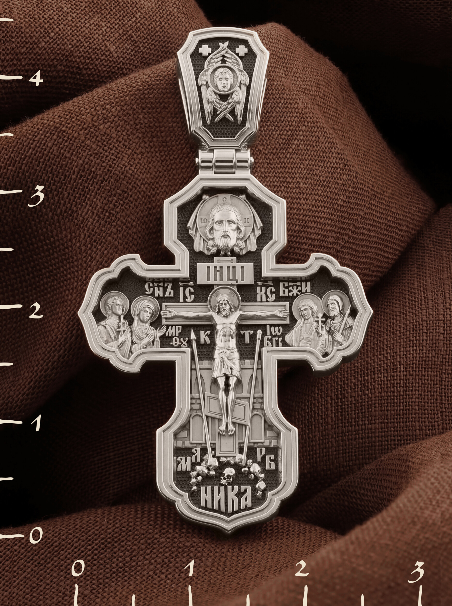 На лицевой стороне креста изображено Распятие Господа и Спасителя нашего Иисуса Христа. Крест- символ спасения и искупления рода человеческого, знамение победы над смертью и адом. Иисус Христос, как искупительная жертва освобождения человечества от власти греха, умер крестной смертью и в третий день воскрес. На верхней табличке, выше головы Иисуса, расположена надпись, составленная Понтием Пилатом — «IНЦI». Она означает «Иисус Назорей, Царь Иудейский». Надпись «IС» « ХС» означает Иисус Христос и помещается на разных сторонах поперечной (большой) перекладины креста. Рядом расположена надпись «Сын Божий». Выше Распятия изображен Нерукотворный образ Господа и Спасителя нашего Иисуса Христа. Слева от Распятия — Пресвятая Богородица и святая мироносица Мария Магдалина с крестом в руке. Справа — апостол и евангелист Иоанн Богослов, один из ближайших учеников Иисуса Христа и сотник Лонгин с крестом в правой руке и копьем — в левой. За крестом высится Иерусалимская стена. Крест стоит на горе камней, символизирующих Голгофу. В ее основании различается череп — это голова Адама. Вдоль креста изображены копие сотника Лонгина и трость с губкой и буквы «К» и «Т». Надпись «МЛРБ» — «место лобное рай бысть» означает, что место лобное стало раем и помещаются в нижней части креста. Рядом — слово «НИКА», что означает «победитель». На православном кресте Христос не умирает, а свободно простирает руки, ладони Иисуса открыты, будто он хочет обнять все человечество, даря им свою любовь и открывая путь к вечной жизни. На кулонном кольце изображен шестикрылый Серафим.