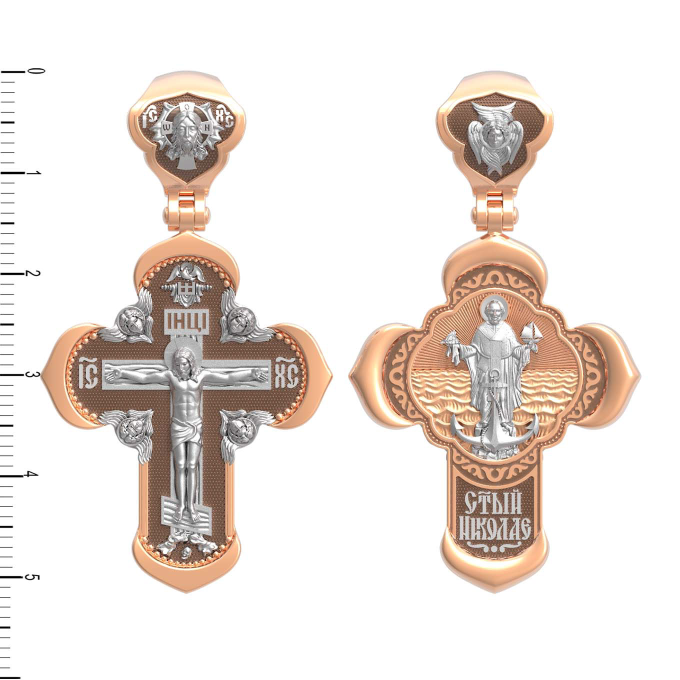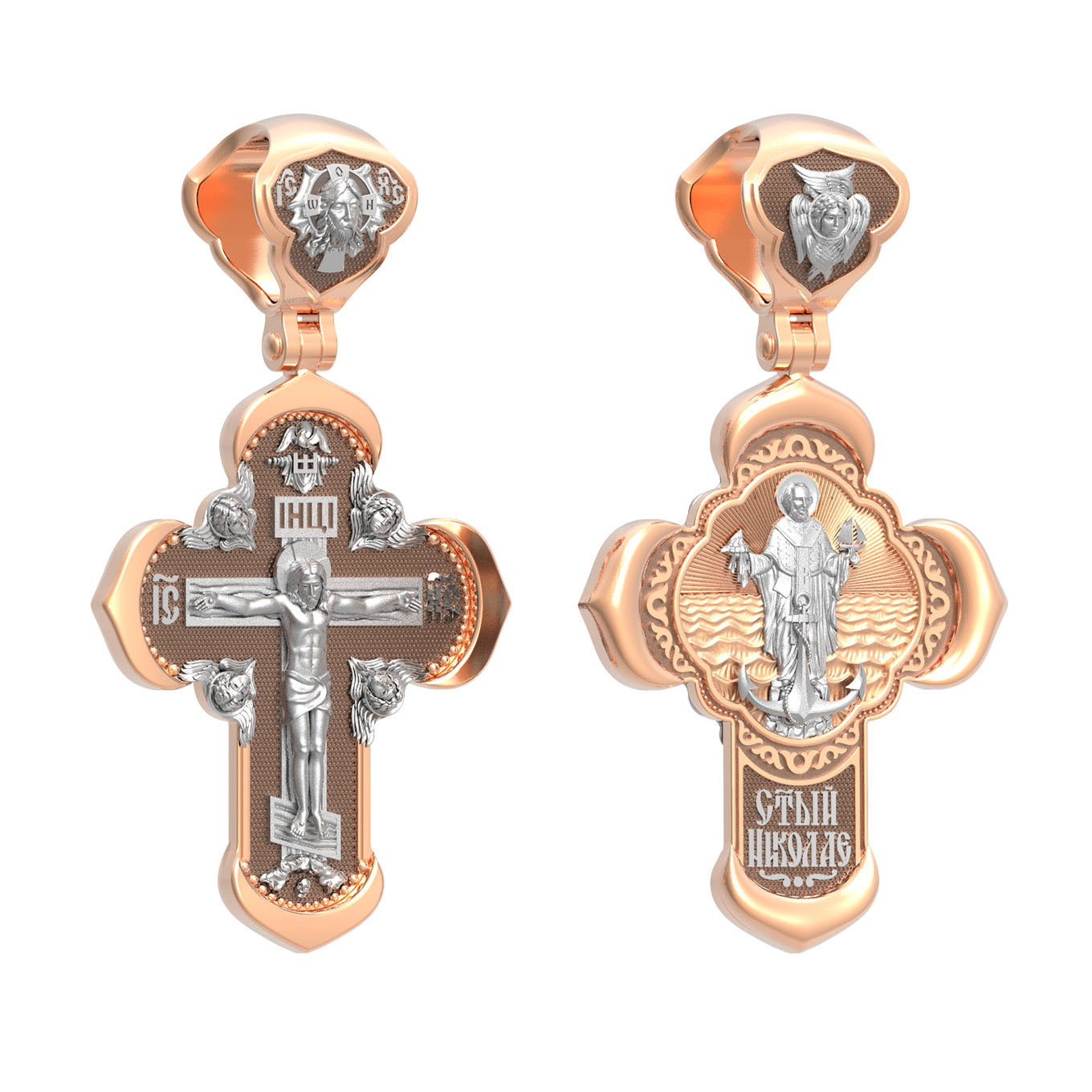 На лицевой стороне креста изображено Распятие Господа и Спасителя нашего Иисуса Христа, отдавшего Себя на смерть, для искупления грехов мира. Крест является символом жертвенной любви Всеблагого Бога к падшим людям, всепобеждающим духовным оружием христиан, основанием и средоточием церковной жизни. Господь сказал: «кто хочет идти за Мною, отвергнись себя, и возьми крест свой, и следуй за Мною». (Мк. 8: 34). На верхней табличке, выше головы Иисуса, расположена надпись, составленная Понтием Пилатом — «IНЦI». Она означает «Иисус Назорей, Царь Иудейский». Надпись «IC» «ХC», означает Иисус Христос, помещается на разных сторонах поперечной перекладины креста. Крест стоит на горе камней, символизирующих Голгофу. В ее основании различается череп– это голова Адама. На кулонном кольце изображен Нерукотворный образ Господа и Спасителя нашего Иисуса Христа, чудесно отпечатавшийся на плате, которым Христос вытер свой лик.