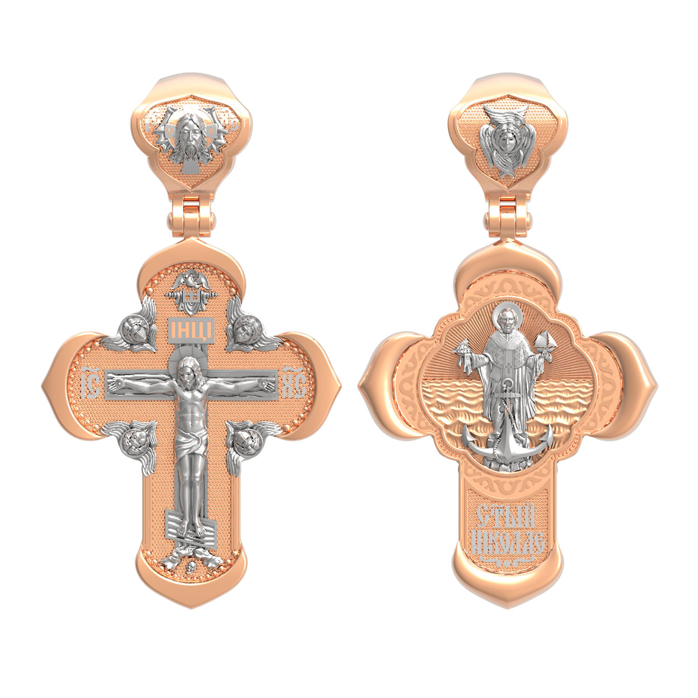На лицевой стороне креста изображено Распятие Господа и Спасителя нашего Иисуса Христа, отдавшего Себя на смерть, для искупления грехов мира. Крест является символом жертвенной любви Всеблагого Бога к падшим людям, всепобеждающим духовным оружием христиан, основанием и средоточием церковной жизни. Господь сказал: «кто хочет идти за Мною, отвергнись себя, и возьми крест свой, и следуй за Мною». (Мк. 8: 34). На верхней табличке, выше головы Иисуса, расположена надпись, составленная Понтием Пилатом — «IНЦI». Она означает «Иисус Назорей, Царь Иудейский». Надпись «IC» «ХC», означает Иисус Христос, помещается на разных сторонах поперечной перекладины креста. Крест стоит на горе камней, символизирующих Голгофу. В ее основании различается череп– это голова Адама. На кулонном кольце изображен Нерукотворный образ Господа и Спасителя нашего Иисуса Христа, чудесно отпечатавшийся на плате, которым Христос вытер свой лик.