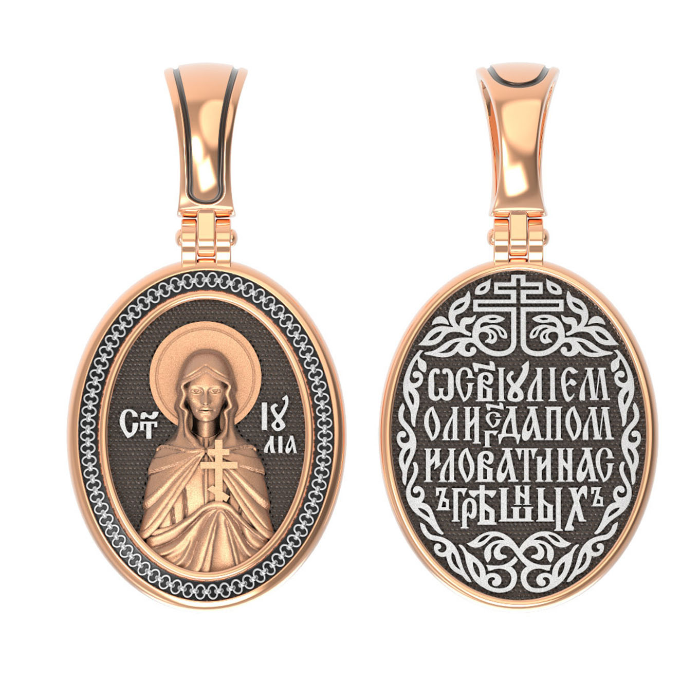 Центральную часть лицевой стороны занимает изображение Святой Мученицы Иулии (Юлии) Корсиканской. Покровительница Корсики, маленькой девочкой попала в плен и была продана в рабство. Служила богатому купцу-язычнику, который старался приобщить ее к своей вере, но юная Юлия свято хранила христианские заповеди, соблюдая себя в чистоте и благочестии. Хозяин удивлялся ее доброму нраву, кротости и смирению. Видя, что она верно служит и усердно работает, оставил ее в покое.