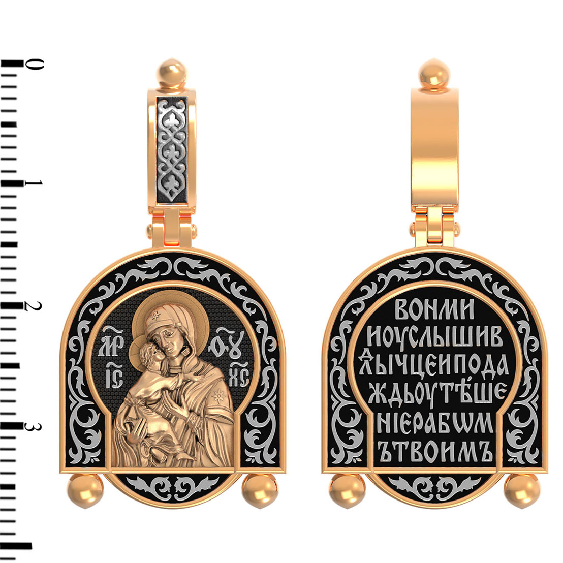 Лицевую сторону возглавляет Владимирская икона Божией Матери — самая Великая русская Святыня, многие века бывшая олицетворением нашей земли. Перед ней венчались на царство государи, избирались патриархи. Пречистой Богородице Владимирской клялись в верности Отечеству солдаты и за нее умирали на поле брани. Именно на ее защиту более всего уповала Россия в самые страшные периоды своей истории. Владимирская икона Божией Матери, по преданию, была написана на доске трапезного стола из дома Иисуса Христа. На Русь она была привезена в начале XII века и с тех пор почитается как главная святыня нашего Отечества. Перед ней молитвенно просят Богородицу об исцелении от телесных недугов, в частности, заболеваний сердца и сердечнососудистой системы. За помощью к ней обращаются во время бедствий, когда нуждаются в защите от врагов.