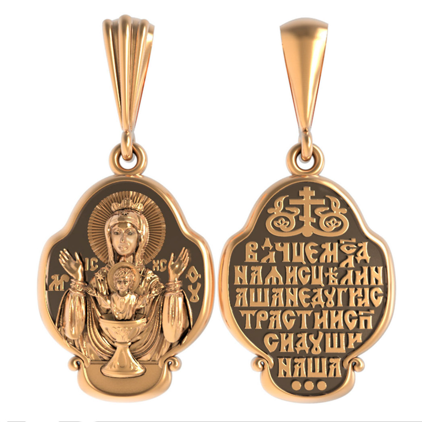 На лицевой части образка изображена икона Божией Матери «Неупиваемая чаша». Икона славится помощью в исцелении зависимостей, помогает людям обрести свободу от греховных страстей.
