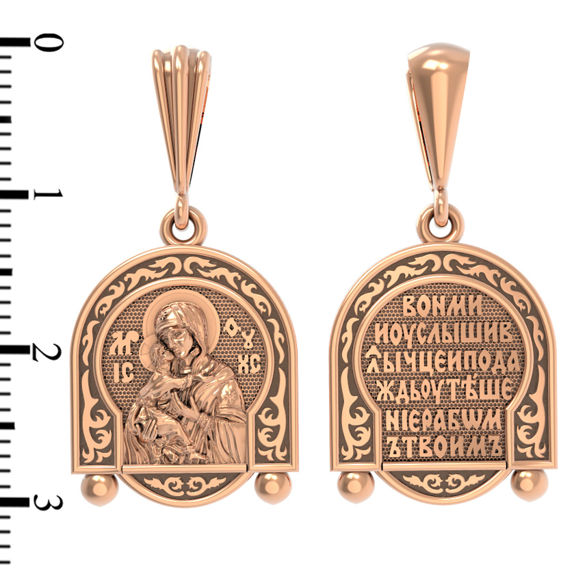 Лицевую сторону возглавляет Владимирская икона Божией Матери — самая великая русская святыня, многие века бывшая олицетворением нашей земли. Перед ней венчались на царство государи, избирались патриархи. Пречистой Богородице Владимирской клялись в верности Отечеству солдаты и за нее умирали на поле брани. Именно на ее защиту более всего уповала Россия в самые страшные периоды своей истории. Владимирская икона Божией Матери, по преданию, была написана на доске трапезного стола из дома Иисуса Христа. На Русь она была привезена в начале XII века и с тех пор почитается как главная святыня нашего Отечества. Перед ней молитвенно просят Богородицу об исцелении от телесных недугов, в частности, заболеваний сердца и сердечнососудистой системы. За помощью к ней обращаются во время бедствий, когда нуждаются в защите от врагов.