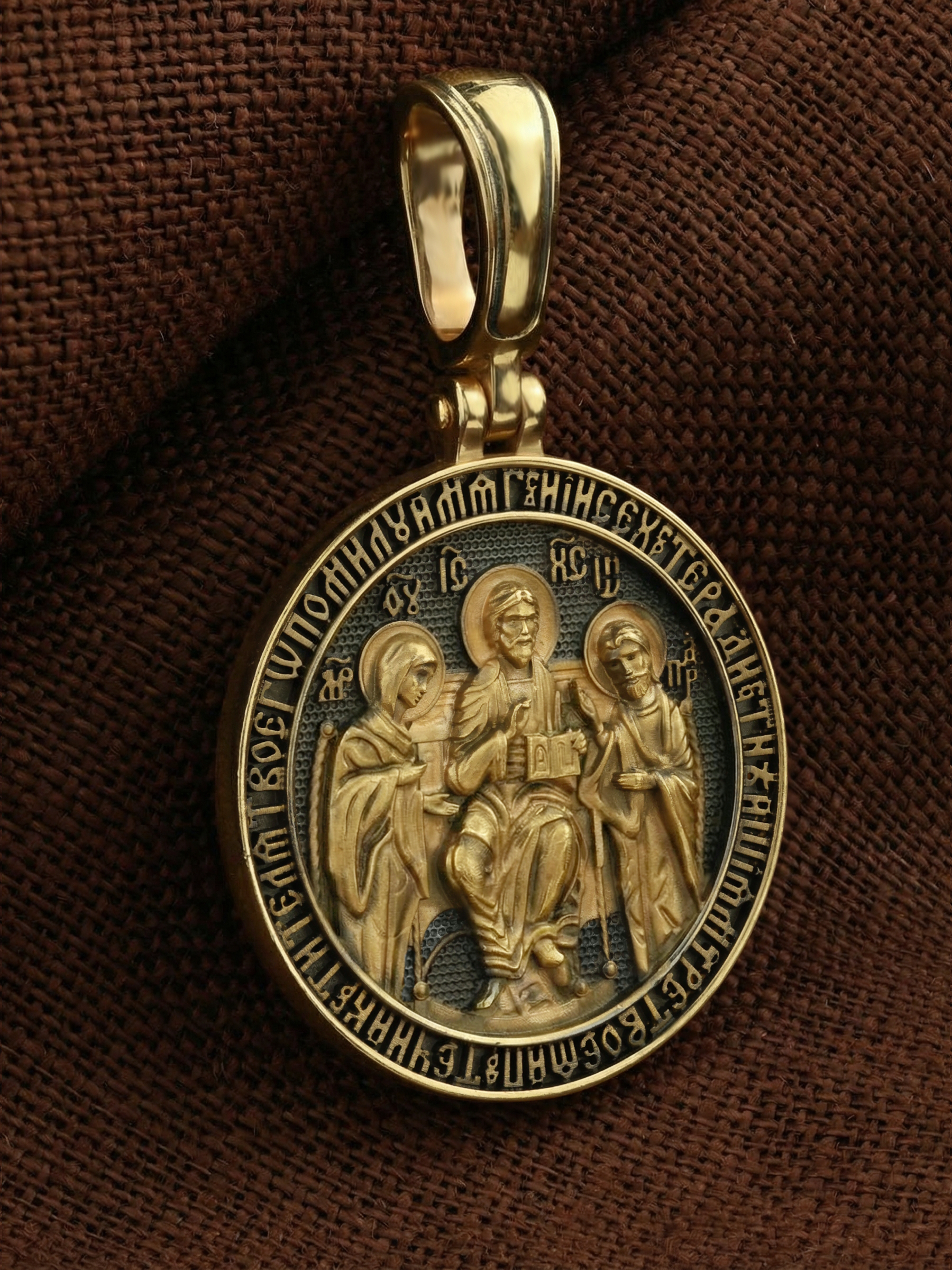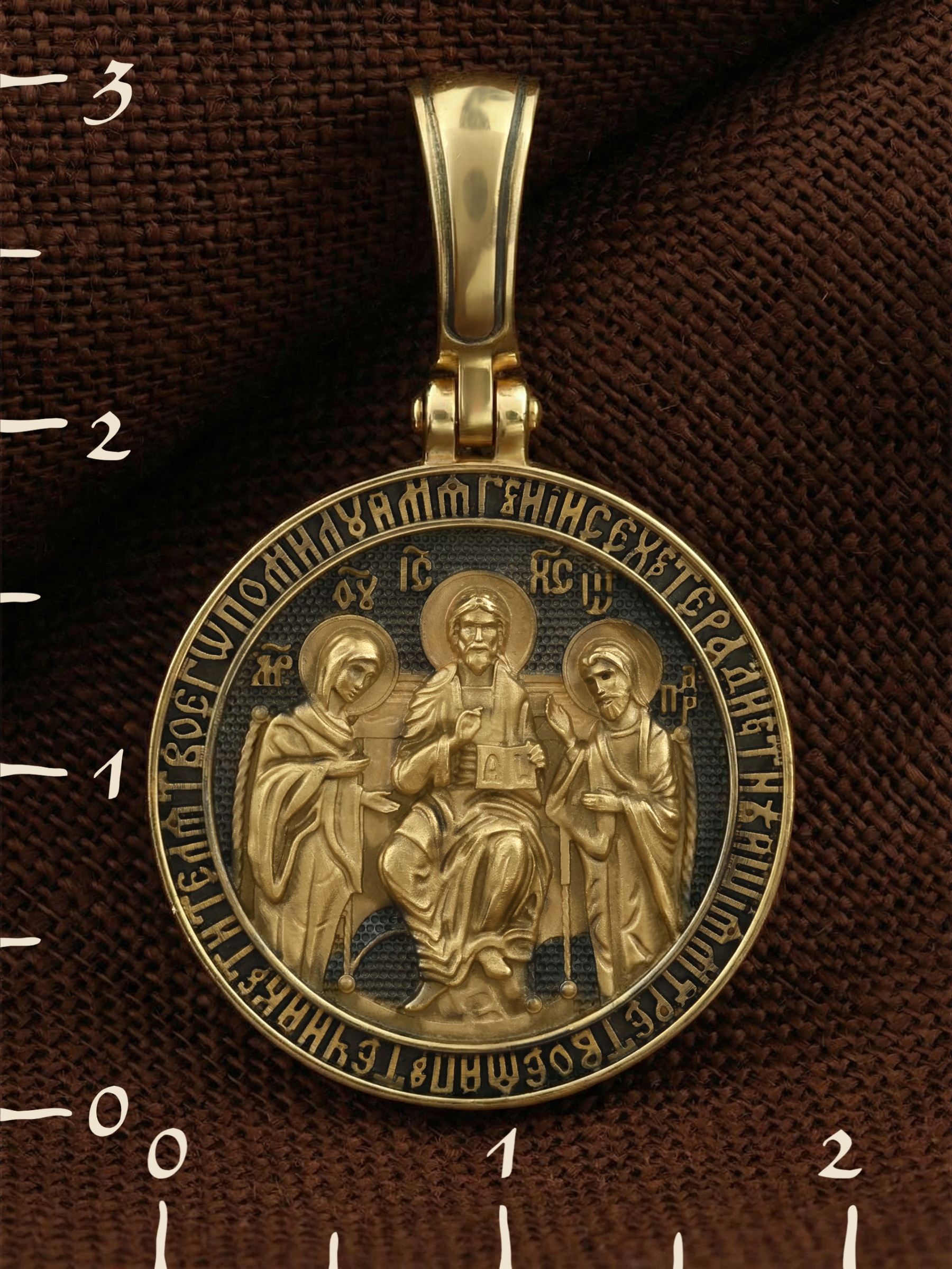 На лицевой стороне образка изображена икона Иисуса Христа Деисус. Он представлен в образе Господа Вседержителя, восседающего на престоле. В его руках — Книга Судеб всего человечества. С двух сторон ему предстоят Пресвятая Богородица и пророк Иоанн Предтеча, Креститель Господень. Первыми помощниками и заступниками человека в его земной жизни являются Матерь Божия и Иоанн Креститель. Поэтому каждый верующий в первую очередь к ним обращает свои молитвы с просьбой о духовной помощи. Такая молитва-прошение помещена на образке: «Господи Иисусе Христе, ради честнейшия Матери Твоея и Предтечи и Крестителя Твоего, помилуй мя».