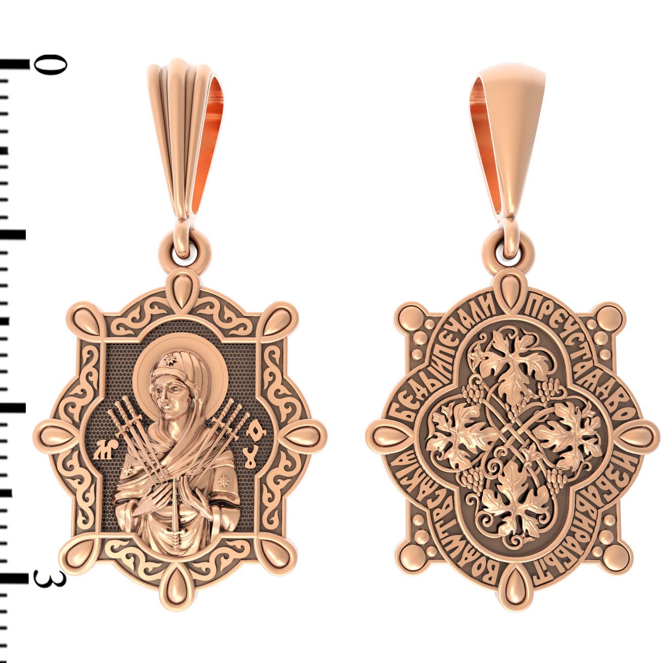 На лицевой стороне образка изображена икона Пресвятой Богородицы «Семистрельная» — одна из самых чудотворных икон на Руси. На протяжении многих веков христиане взывали к Царице Небесной через эту икону, если в стране начинались войны или мятежи.