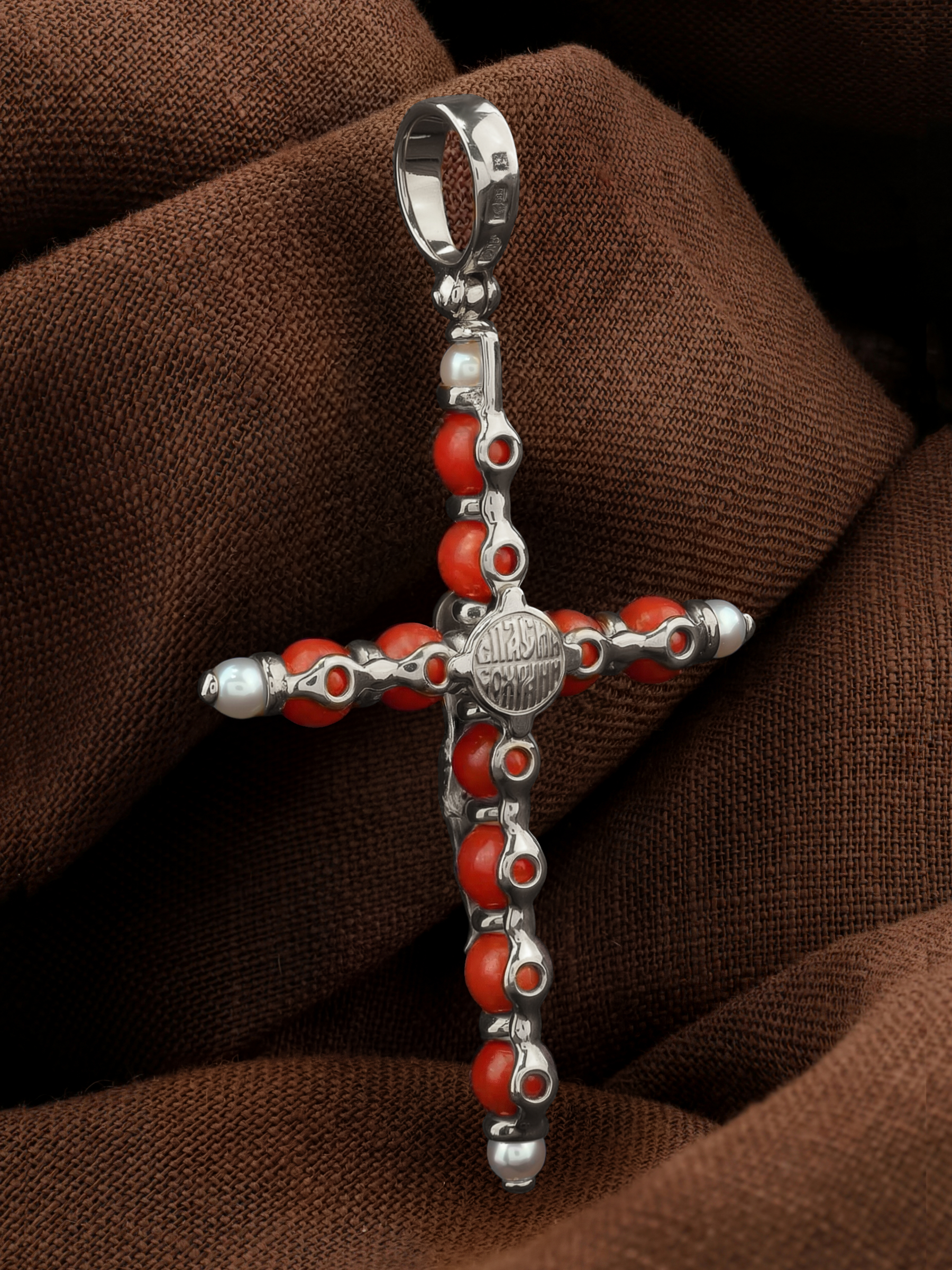 Крест из белого золота c жемчугом и кораллом
