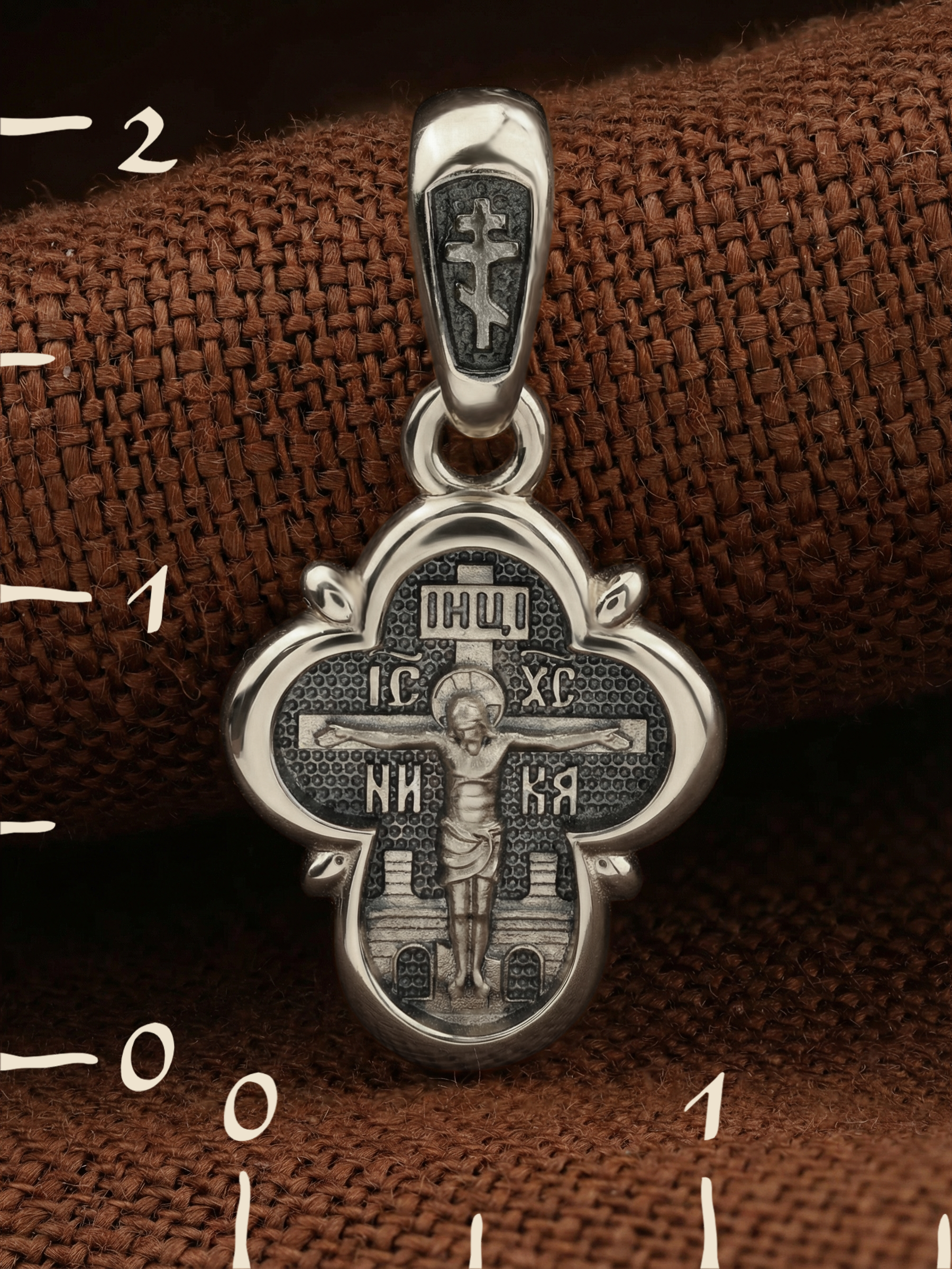 На лицевой стороне креста изображено Распятие Господа и Спасителя нашего Иисуса Христа, отдавшего Себя на смерть, для искупления грехов мира. Крест является символом жертвенной любви Всеблагого Бога к падшим людям, всепобеждающим духовным оружием христиан, основанием и средоточием церковной жизни. Господь сказал: «кто хочет идти за Мною, отвергнись себя, и возьми крест свой, и следуй за Мною». (Мк. 8: 34). На верхней табличке, выше головы Иисуса, расположена надпись, составленная Понтием Пилатом — «IНЦI». Она означает «Иисус Назорей, Царь Иудейский». Надпись «IC» «ХC», означает Иисус Христос, помещается на разных сторонах поперечной перекладины креста. Рядом — слово «НИКА», что означает «победитель». За крестом высится Иерусалимская стена. Над вершиной Распятия, на кулонном кольце, помещен крест.