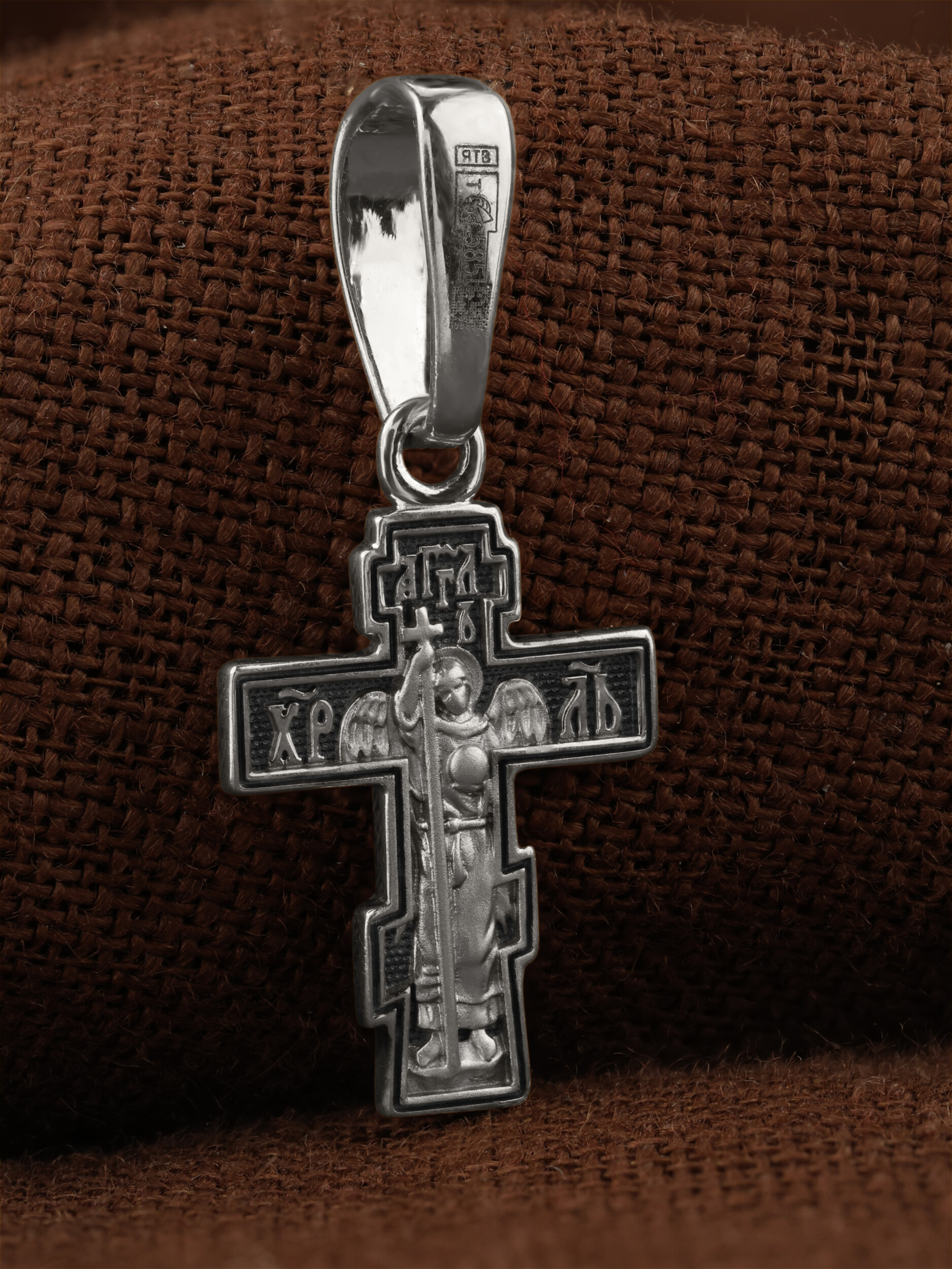На оборотной стороне креста изображен святой Ангел-Хранитель в виде прекрасного юноши держащего в правой руке крест, а в левой — сферу. Ангел-Хранитель — это Ангел приставляемый Богом к человеку при крещении для охраны и помощи в добрых делах. Невидимо пребывая при нас постоянно, он, руководствуя нас ко спасению, не только по нашему желанию таинственно наставляет нас на все доброе и полезное, не только возносит наши молитвы к Богу, но еще и сам от себя охраняют и защищают нас от врагов видимых и невидимых, ходатайствует за нас пред Богом.