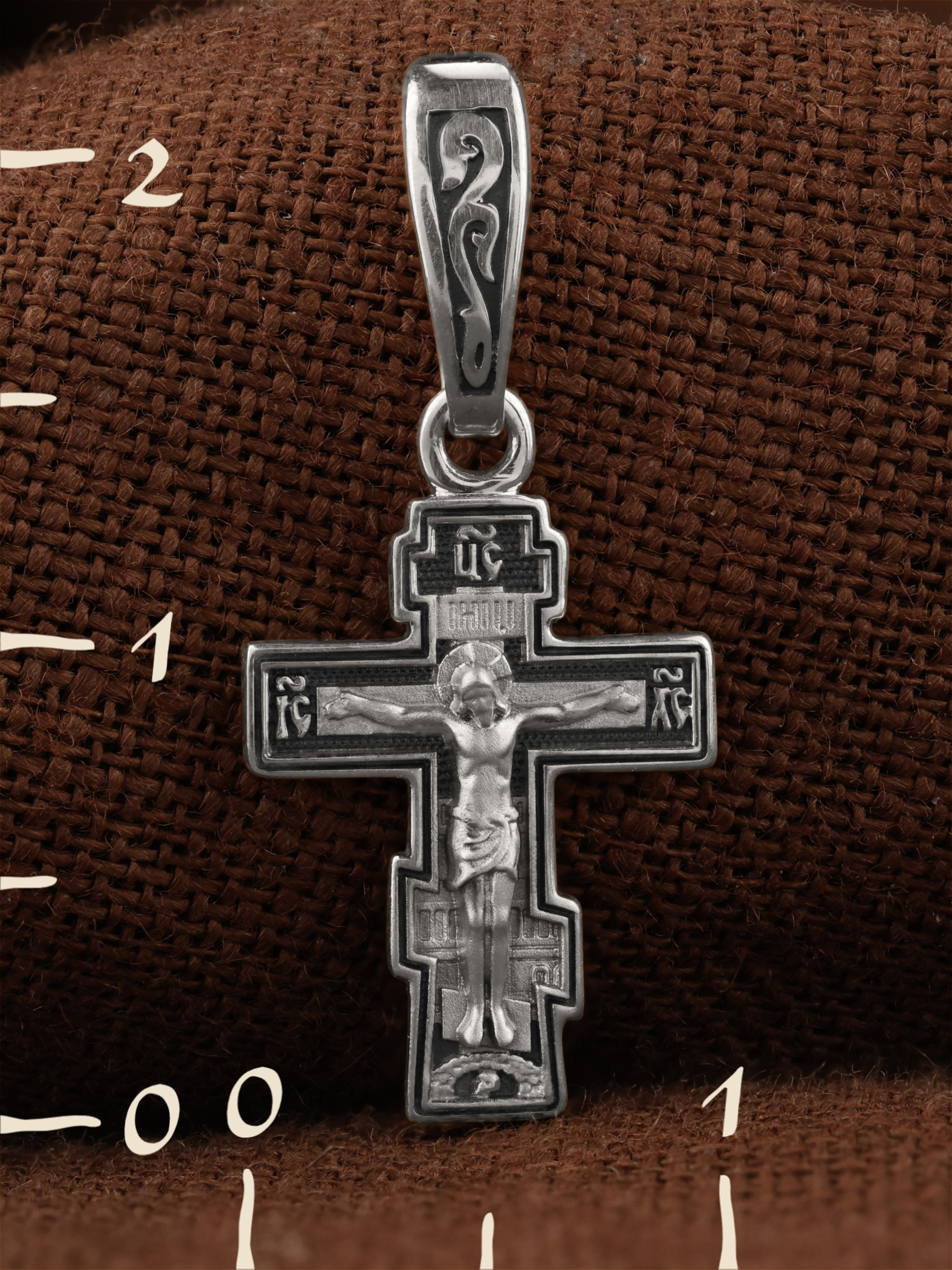 На лицевой стороне креста изображено Распятие Господа и Спасителя нашего Иисуса Христа, отдавшего Себя на смерть для искупления грехов мира. Крест является символом жертвенной любви Всеблагого Бога к падшим людям, всепобеждающим духовным оружием христиан, основанием и средоточием церковной жизни. Над вершиной Распятия помещена надпись «Царь Славы». На верхней перекладине расположена надпись «IНЦI». Она символизирует титло — табличку, на которой, согласно Евангелию, было начертано: Иисус Назорей, Царь Иудейский. Надпись «IC» «ХC»», означает Иисус Христос, помещаются на разных сторонах поперечной перекладины креста. Ниже помещена надпись «НИКА», что означает «победитель». Крест стоит на горе камней, символизирующих Голгофу. Под подножием Креста изображена покоящаяся голова (череп) Адама.