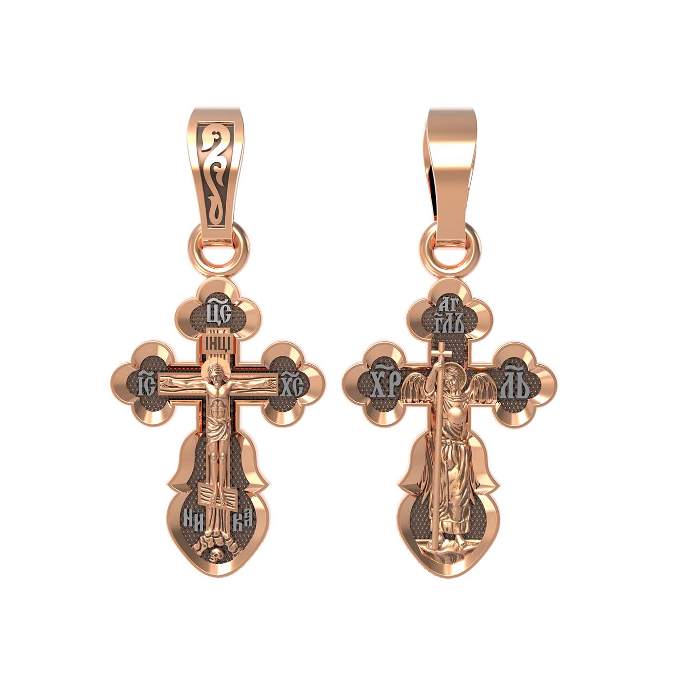 На оборотной стороне креста изображен святой Ангел-Хранитель в виде прекрасного юноши держащего в правой руке крест, а в левой — сферу. Ангел-Хранитель — это Ангел приставляемый Богом к человеку при крещении для охраны и помощи в добрых делах. Невидимо пребывая при нас постоянно, он, руководствуя нас ко спасению, не только по нашему желанию таинственно наставляет нас на все доброе и полезное, не только возносит наши молитвы к Богу, но еще и сам от себя охраняют и защищают нас от врагов видимых и невидимых, ходатайствует за нас пред Богом.