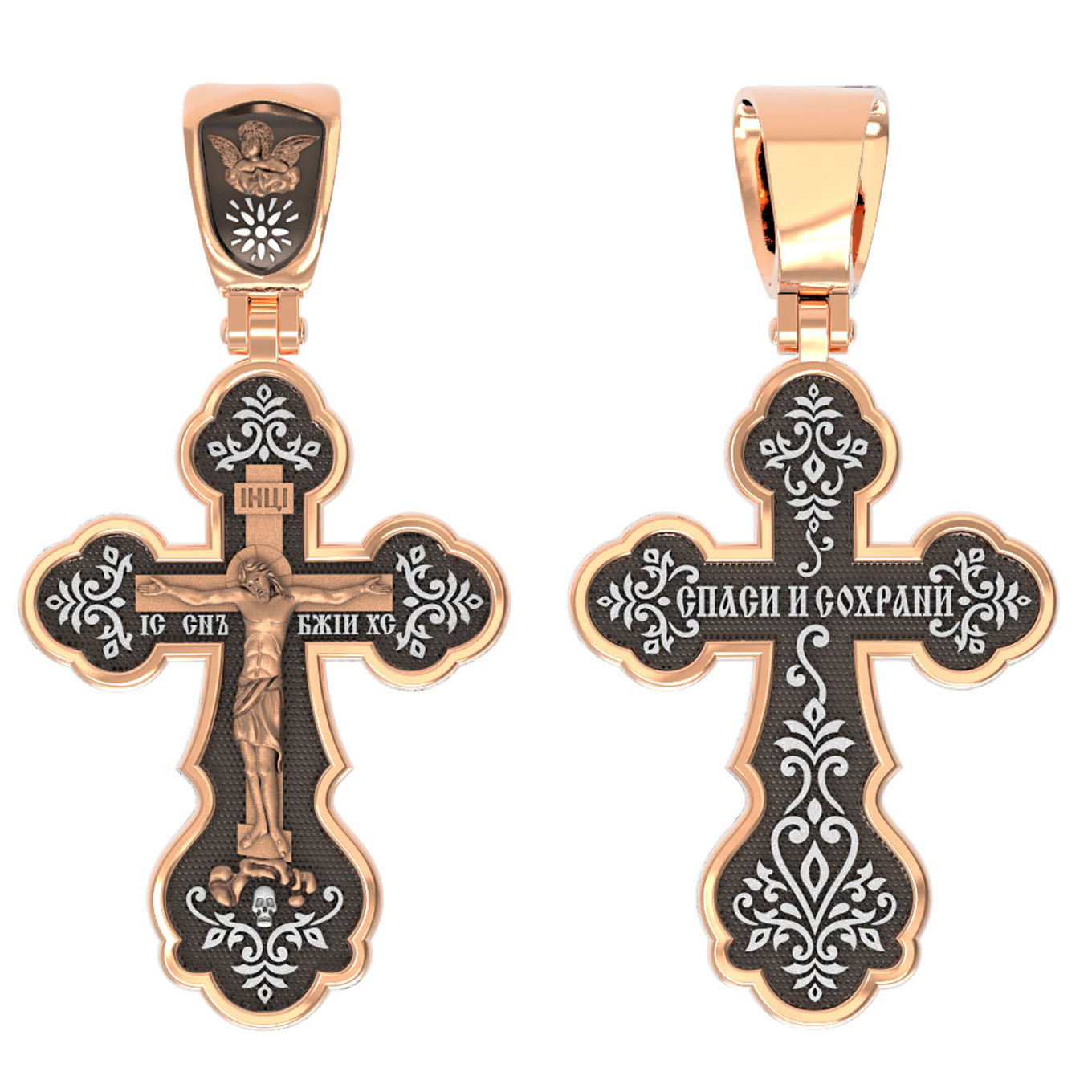 На лицевой стороне креста изображено Распятие Господа и Спасителя нашего Иисуса Христа. Христос, подвергнутый на кресте мучительной казни, своими страданиями искупил нас от древнего греха и даровал нам жизнь вечную. Крест означает своей вертикальной прямой линией справедливость и непреложность Божественных заповедей, прямоту Божией правды и истины, не допускающей никаких нарушений. Эта прямота пересекается главной поперечной перекладиной, означающей любовь и милость Божию к падшим и падающим грешникам, ради которой и был принесен в жертву Сам Господь, взявший на Себя грехи всех людей. На верхней табличке, выше головы Иисуса, расположена надпись, составленная Понтием Пилатом — «IНЦI». Она означает «Иисус Назорей, Царь Иудейский». Надпись «IС ХС» означает Иисус Христос и словосочетание «СЫН БОЖИЙ», что означает божественную природу Иисуса Христа, помещается на разных сторонах поперечной перекладины креста. Крест стоит на горе камней, символизирующих Голгофу. Под подножием Креста изображена покоящаяся голова (череп) Адама, грехи которого Христос омыл Своею Кровью. Христос в Своей Божественной любви, над которой смерть не властна и которая, страдая, и не страдает в обычном смысле, простирает к людям со Креста Свои объятия, в которые призывается и привлекается весь мир. Поэтому Тело Его не висит, а торжественно покоится на Кресте. Здесь Христос, распятый и умерший, удивительным образом жив в самой смерти Своей. На кулонном кольце изображен Ангел Херувим. Херувимы сияют всегда светом Богопознания, ведением таин и глубин премудрости Божией, сами просвещаемые и других просвещающие.