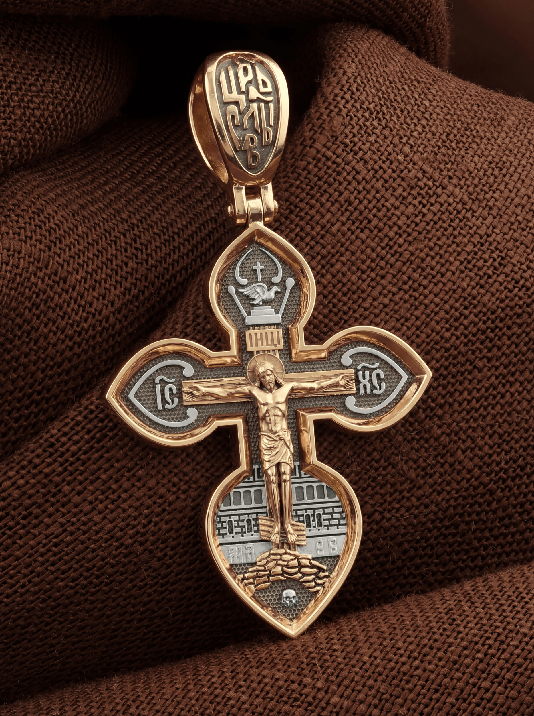На лицевой стороне нательного креста изображено Распятие Господа нашего Иисуса Христа. Крест Господень стоит на небольшом каменистом возвышении, символизирующем гору Голгофу, которая обозначена буквами МЛРБ (Место Лобное Рай Бысть). Над головой Господа на поперечной перекладине написано «ИНЦИ», что символизирует табличку, которая была прибита к Кресту, с надписью «Иисус Назорей Царь Иудейский».По сторонам основной перекладины расположены позолоченные рельефные инициалы Христа «ИС ХС».