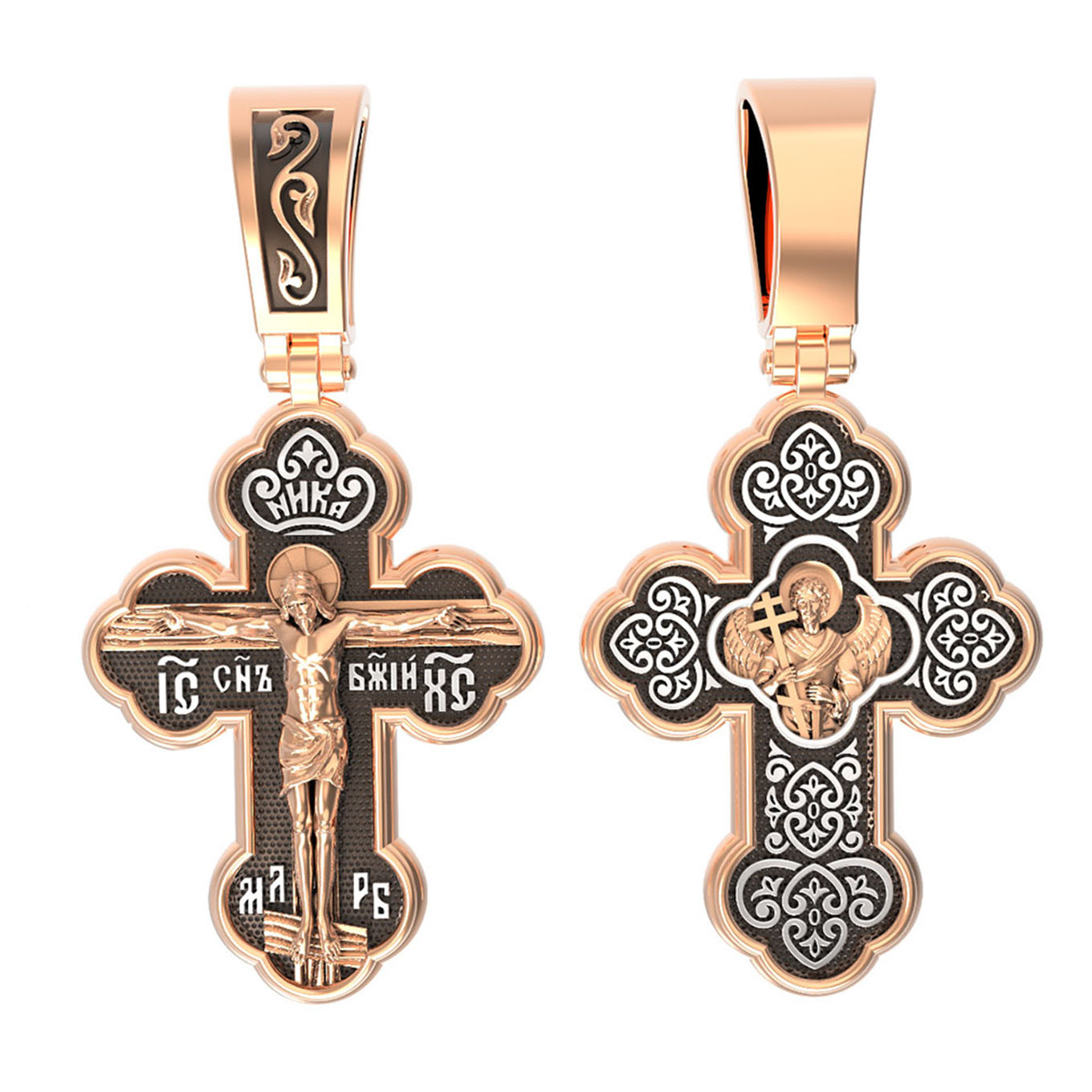 Крест нательный четырехконечный с трехлепестковыми завершениями перекладин. На лицевой стороне креста изображено Распятие, потому что это орудие казни Иисус Христос сделал орудием победы над грехом и смертью. Своими страданиями Он искупил грехи человечества, умерев и сошествовав во ад, победил сатану, освободил души праведников от вечной смерти и открыл им небесные врата рая. Жертва Христа сделала возможным спасение для каждого человека. На православном кресте Христос не умирает, а свободно простирает руки, ладони Иисуса открыты, будто он хочет обнять все человечество, даря им свою любовь и открывая путь к вечной жизни. Над головой Христа надпись — «НИКА» (греч. — Победитель). С обеих сторон горизонтальной перекладины надписи — монограмма святого имени Христа — «ИС ХС», а рядом с ней словосочетание «СНЪ БЖIЙ» — «СЫН БОЖИЙ». Две пары букв на кресте «МЛ» «РБ» означают: Место Лобное Рай Бысть. Возвышение, на котором стоит Крест, символизирует гору Голгофу, на которой произошло Распятие. У подножия Креста изображают прах Адама, обозначенный черепом.