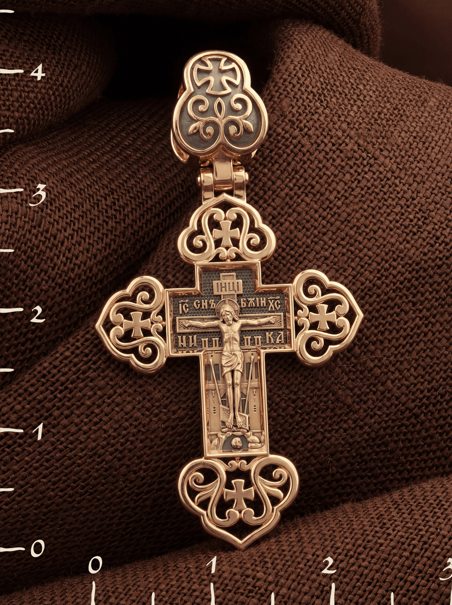 На лицевой стороне изображено Распятие. Над титлом видим слова «ЦРЬ СЛВЫ» — Царь Славы. Верхняя перекладина символизирует собой табличку с надписью «IHЦI» — Иисус Назарянин Царь Иудейский. Над перекладиной пишется сокращенно имя Спасителя «IC XC» — Иисус Христос и словосочетание «СНЪ БЖIЙ» — СЫН БОЖИЙ. Ниже перекладины добавляется «НИКА» (греч. — Победитель). Возвышение, на котором стоит Крест, символизирует гору Голгофу, на которой произошло Распятие. У подножия Креста изображают прах Адама, обозначенный черепом. Рядом с Крестом из горы выступают орудия страданий Господа — трость и копие, обозначенные буквами Т и К.