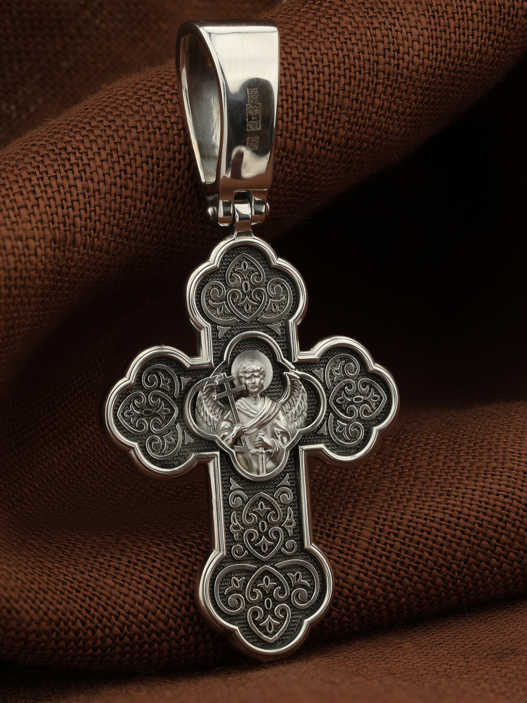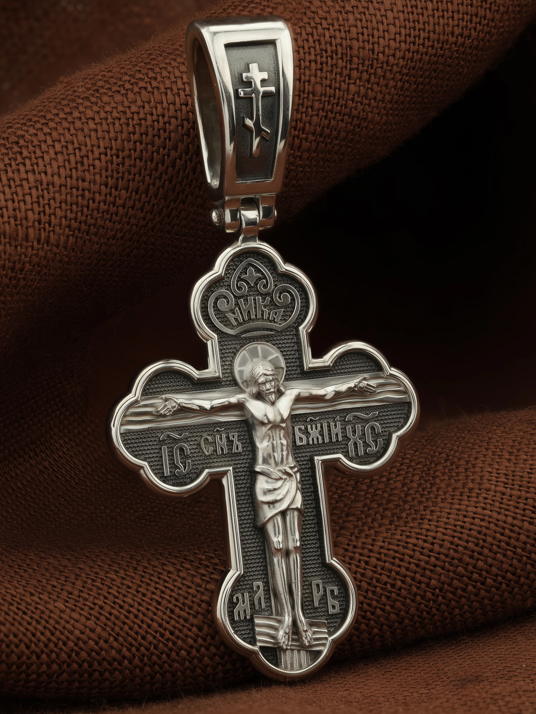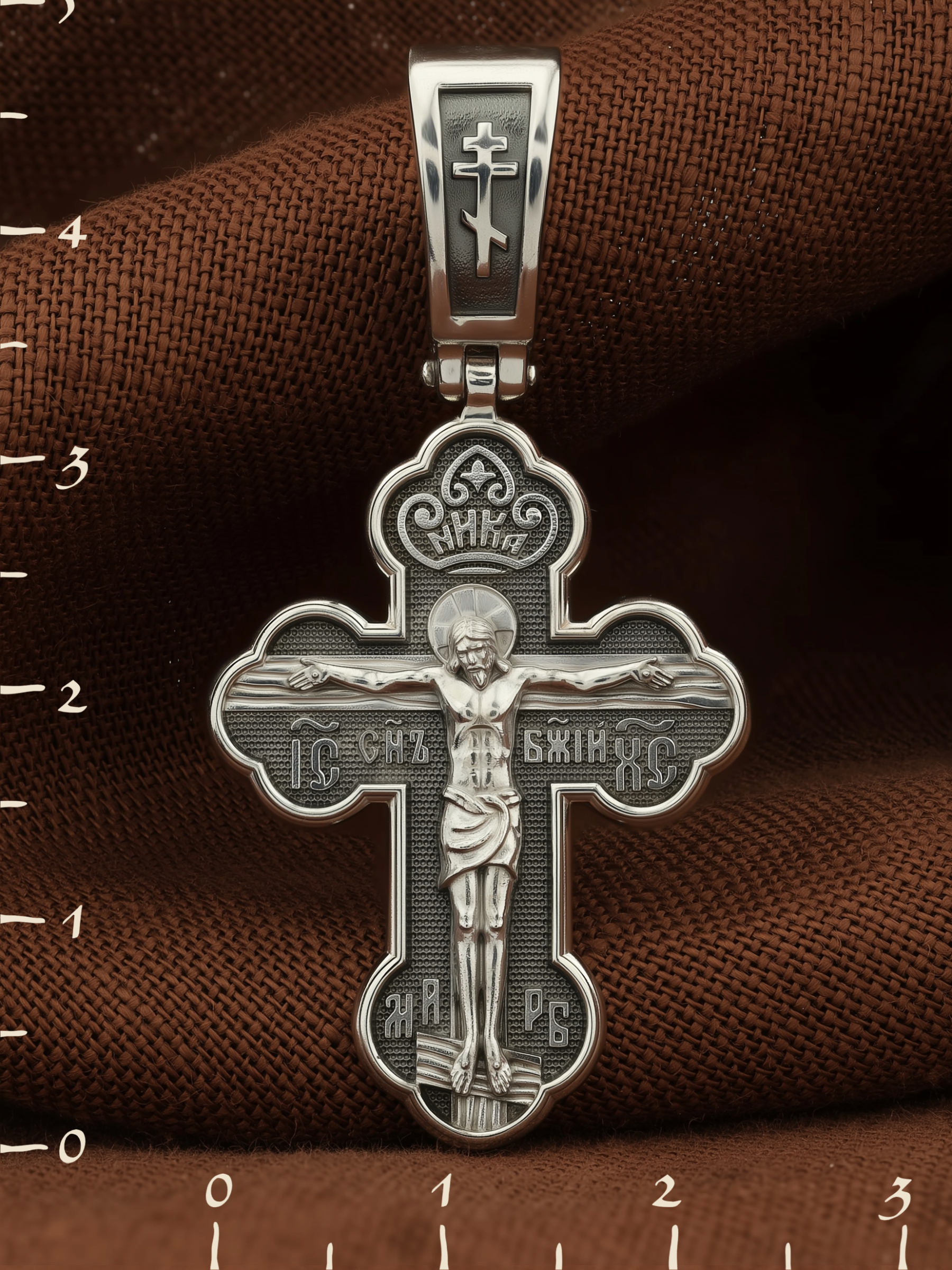 Крест нательный четырехконечный с трехлепестковыми завершениями перекладин. Основой композиции лицевой стороны креста является Распятие Иисуса Христа. С обеих сторон горизонтальной перекладины надписи — монограмма святого имени Христа — «ИС ХС», а под ней «Сын Божий». Над головой Христа надпись — «НИКА» (Победитель). В подножии мы видим изображенную гору Голгофу в виде скалистой горки, а так же буквы «МЛ» «РБ», которые означают: «Место Лобное Рай Бысть». Крест, на котором Спаситель мира принес Искупительную жертву, открыл врата рая, затворившиеся после грехопадения Адама. Поэтому Лобное место (Голгофа) стало раем.