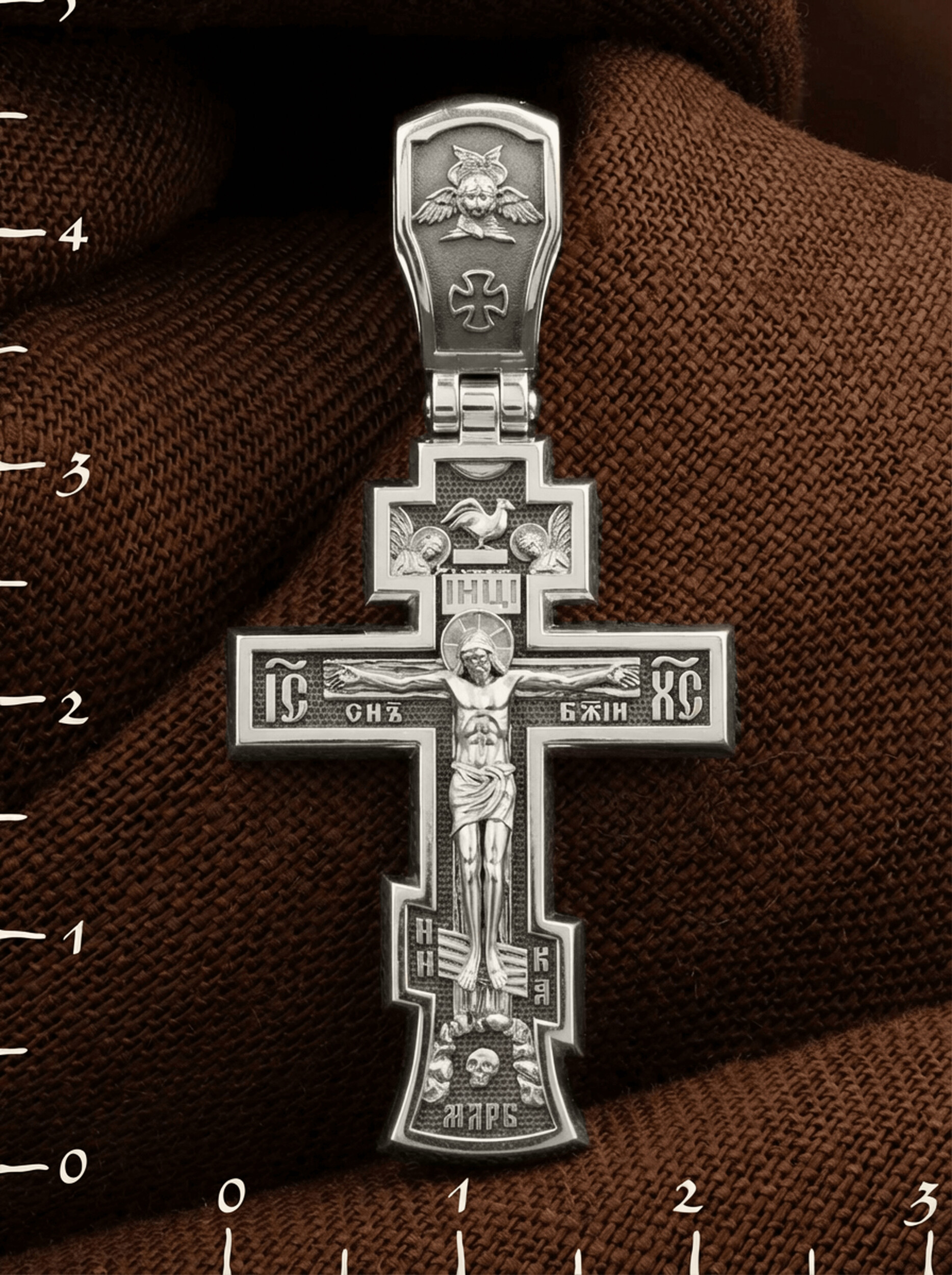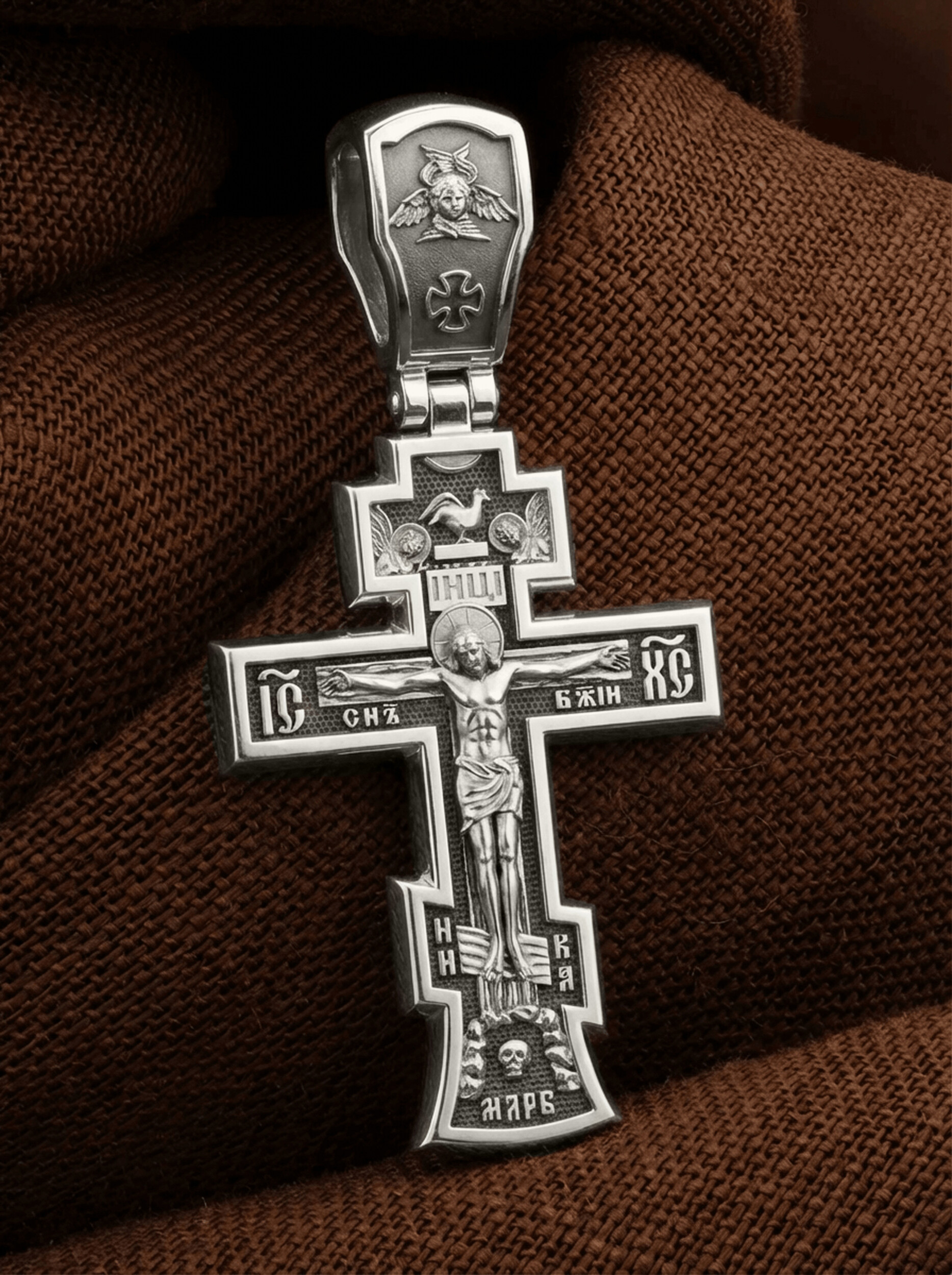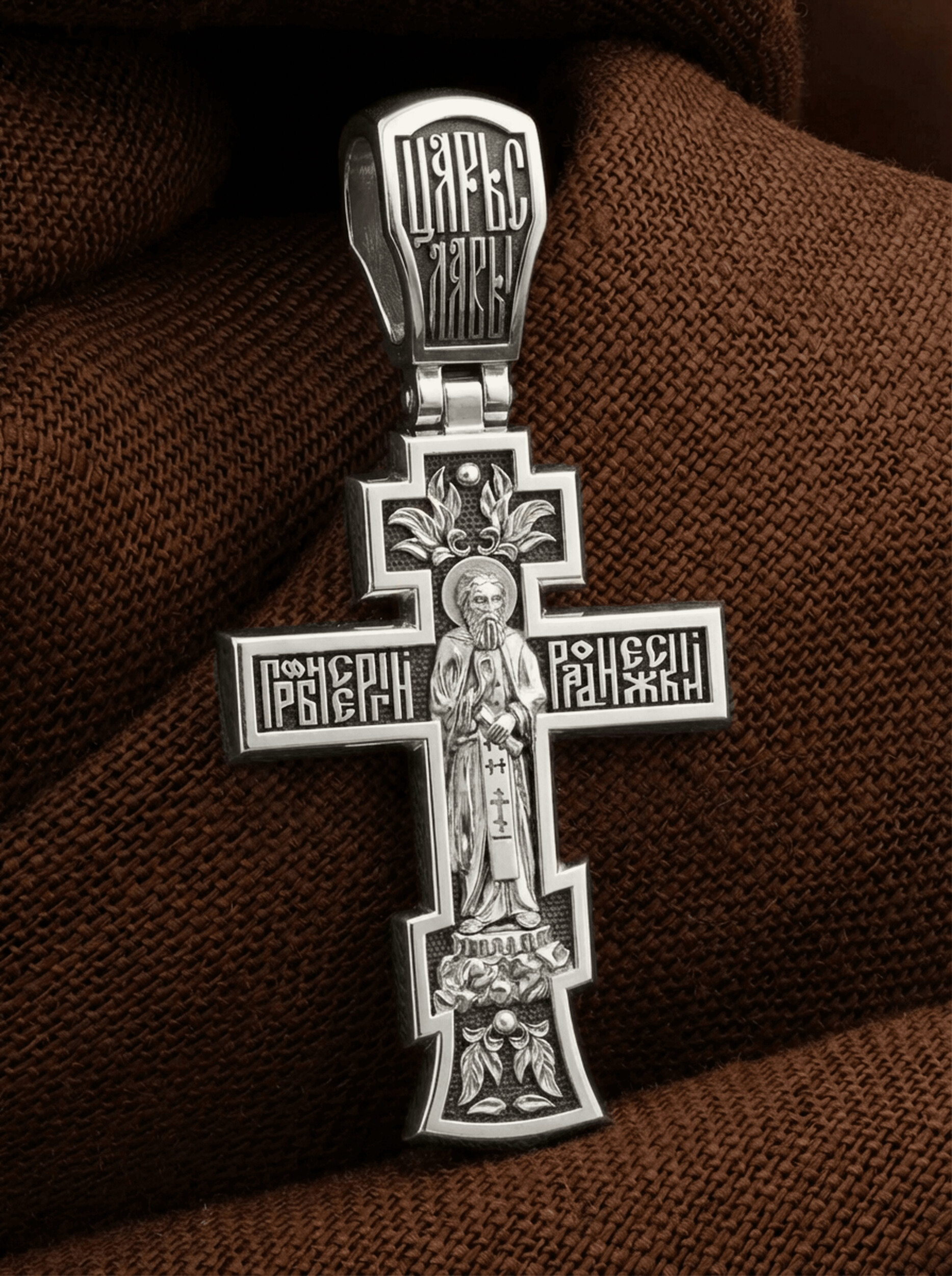 На лицевой стороне этого креста центральную часть занимает икона Распятия Христа — образ жертвы, принесенной Господом за грехи людей. Именно ко Христу, сошедшему на землю ради нашего спасения, возносятся все молитвы. Рядом с Его образом помещены слова — «НИКА» и «Сын Божий». Эти слова характеризуют Господа как Великого Архиерея, победителя смерти. Также Распятие сопровождается надписями, олицетворяющими Христа — это святое имя Христа «IC» (Иисус) «ХС» (Христос). На кулонном кольце написано «Царь Славы».