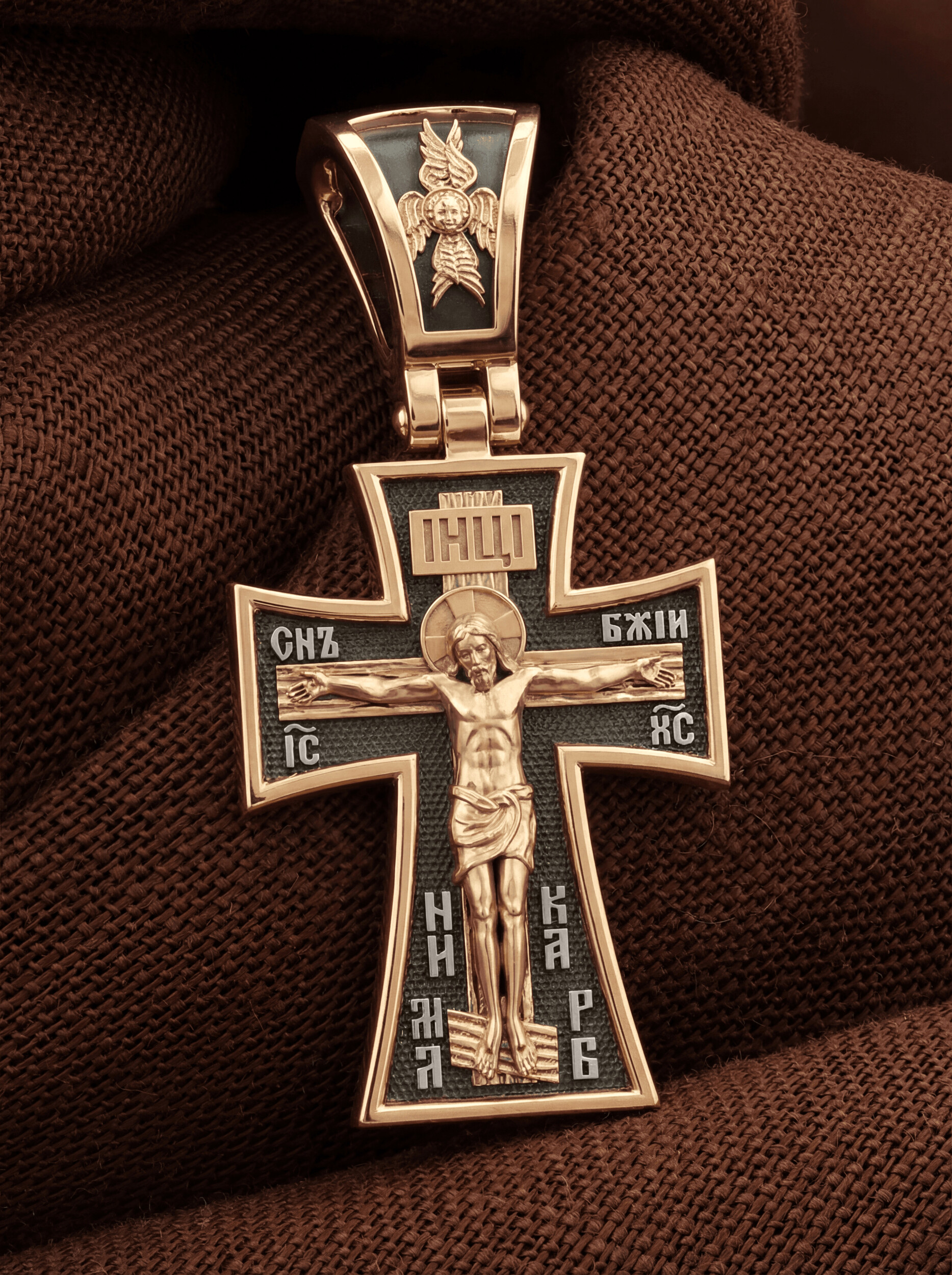 На лицевой стороне креста изображено Распятие, потому что это орудие казни Иисус Христос сделал орудием победы над грехом и смертью. Своими страданиями Он искупил грехи человечества, умерев и сошествовав во ад, победил сатану, освободил души праведников от вечной смерти и открыл им небесные врата рая. Жертва Христа сделала возможным спасение для каждого человека. На православном кресте Христос не умирает, а свободно простирает руки, ладони Иисуса открыты, будто он хочет обнять все человечество, даря им свою любовь и открывая путь к вечной жизни. Верхняя перекладина символизирует собой табличку с надписью «IHЦI» — Иисус Назарянин Царь Иудейский. Над перекладиной пишется и словосочетание «СНЪ БЖIЙ» — СЫН БОЖИЙ, ниже перекладины добавляется имя Спасителя «IC XC» — Иисус Христос. Рядом с образом Христа помещены слова — «НИКА» (греч. — Победитель). Возвышение, на котором стоит Крест, символизирует гору Голгофу, на которой произошло Распятие. У подножия Креста изображают прах Адама, обозначенный черепом. Буквы «МЛ» «РБ», написанные в нижней части креста, означают: «Место Лобное Рай Бысть».
