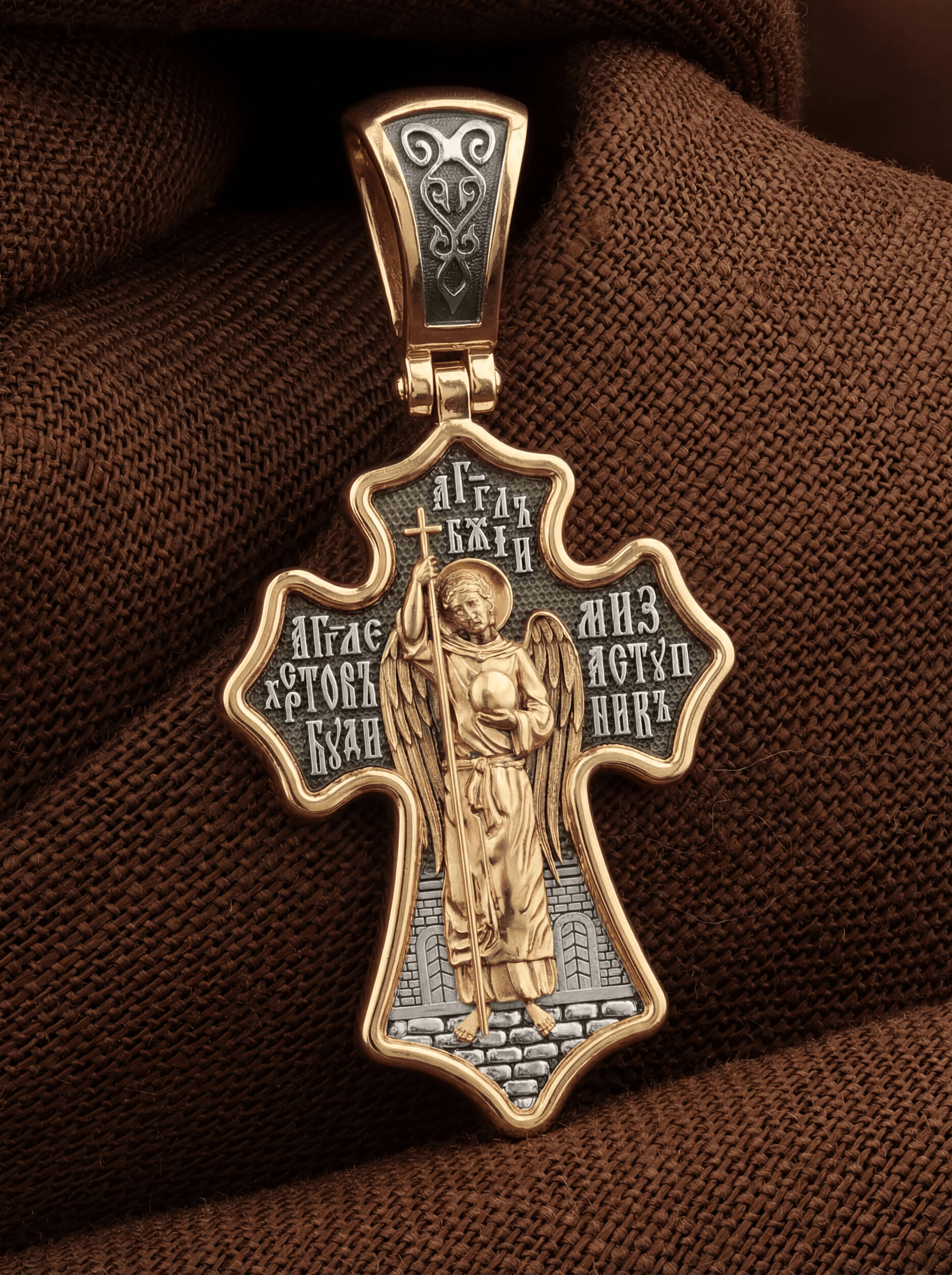 Оборотную сторону креста возглавляет Ангел Хранитель. Он защищает человека от злых духовных и физических нападений. Ангел не может нарушить свободу воли человека, поэтому его надо молитвенно просить о помощи. Вокруг его образа написана молитва: «Ангеле Христов, буди ми заступник».