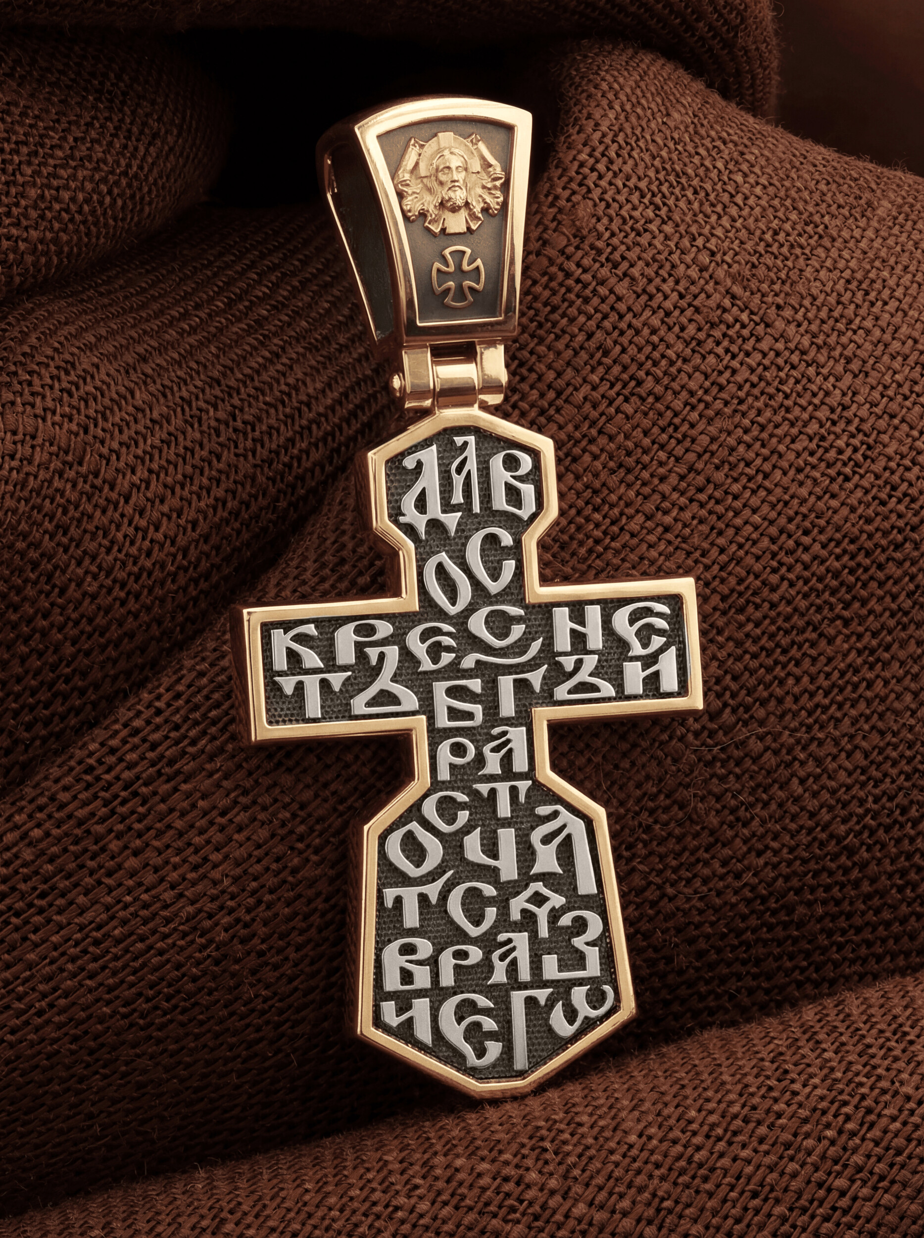 Всю оборотную часть креста занимает начальный стих оградительной молитвы Честному Кресту Господню: «Да воскреснет Бог, и расточатся врази Его».