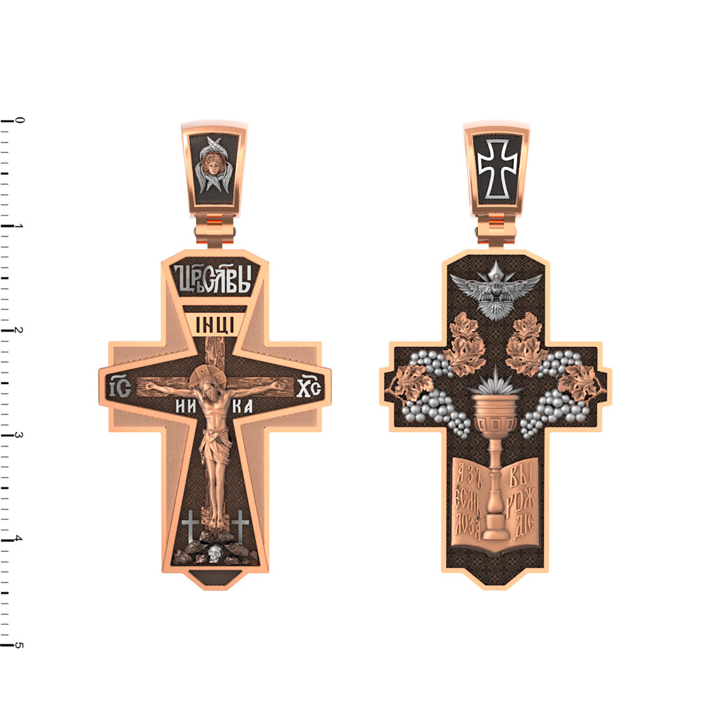 На обороте креста изображение голубя — символ Духа Святого, гроздья винограда — символы церкви и евхаристии, чаша и дискос — символ Таинства Причащения. «Я есмь лоза, — говорил Иисус Христос Своим ученикам, — а вы ветви; кто пребывает во Мне, и Я в нем, тот приносит много плода» (Ин. 15, 5), «Я есмь истинная виноградная лоза, а Отец Мой — виноградарь».