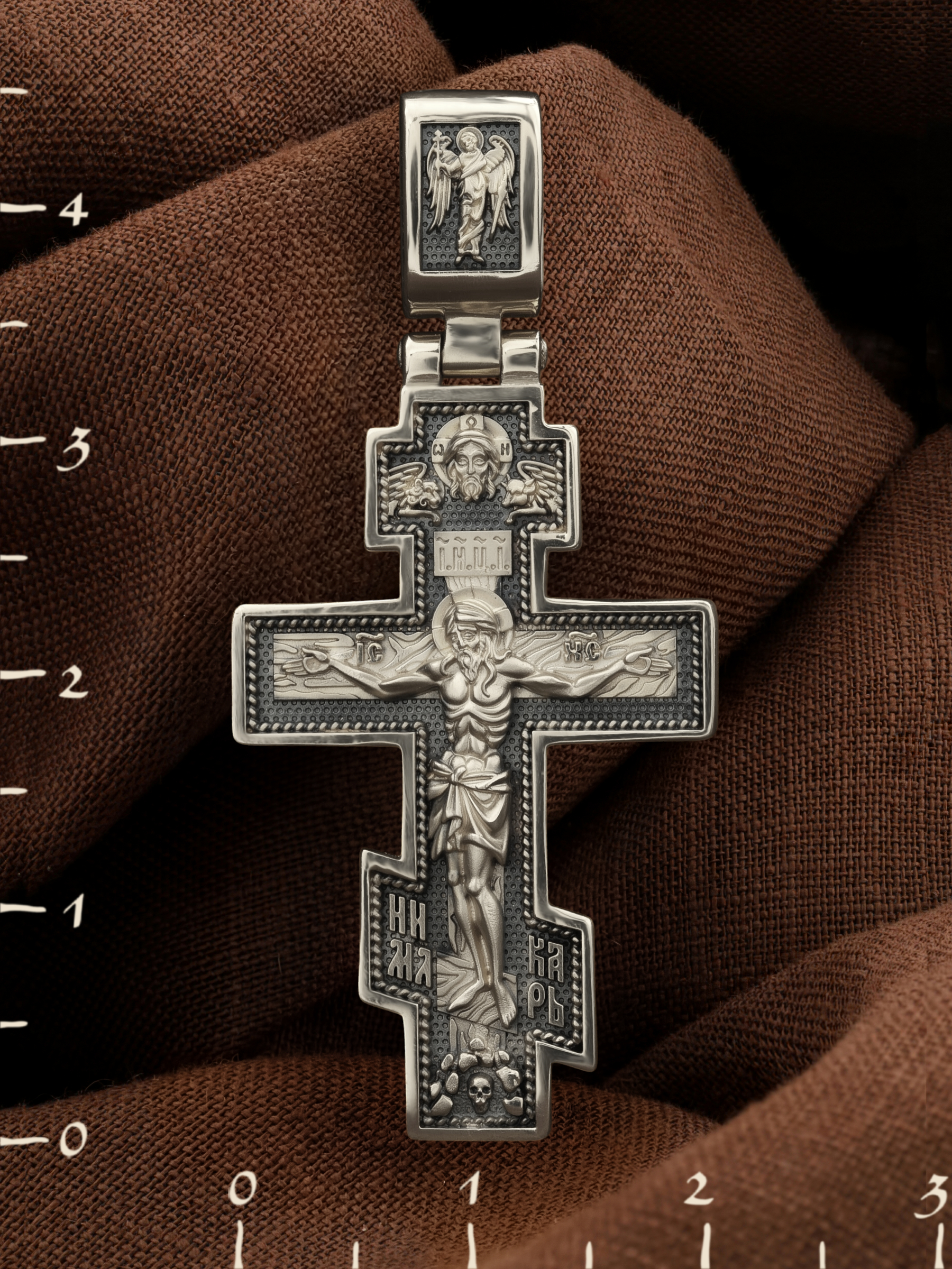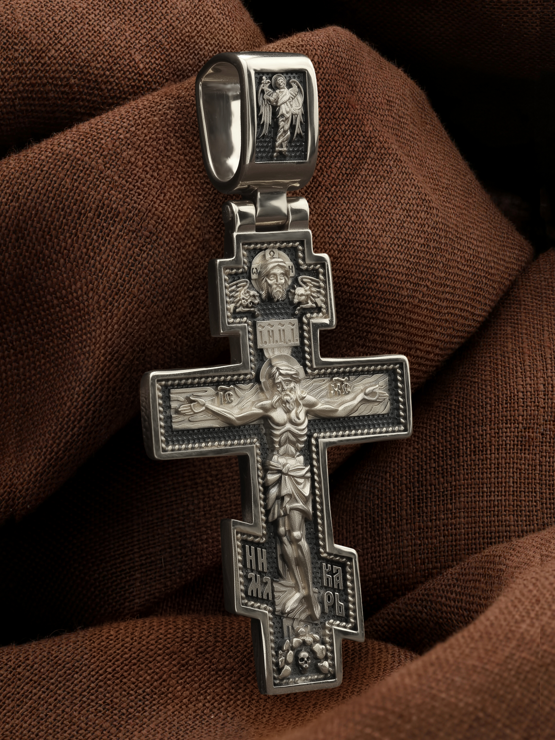 На лицевой стороне креста изображено Распятие, потому что это орудие казни Иисус Христос сделал орудием победы над грехом и смертью. Своими страданиями Он искупил грехи человечества, умерев и сошествовав во ад, победил сатану, освободил души праведников от вечной смерти и открыл им небесные врата рая. Жертва Христа сделала возможным спасение для каждого человека. На православном кресте Христос не умирает, а свободно простирает руки, ладони Иисуса открыты, будто он хочет обнять все человечество, даря им свою любовь и открывая путь к вечной жизни. Верхняя перекладина символизирует собой табличку с надписью «IHЦI» — Иисус Назарянин Царь Иудейский. У подножия добавляется: «НИКА» (греч. — Победитель) и «МЛРБ» — Место Лобное Рай Бысть. Возвышение, на котором стоит Крест, символизирует гору Голгофу, на которой произошло Распятие. У подножия Креста изображают прах Адама, обозначенный черепом.