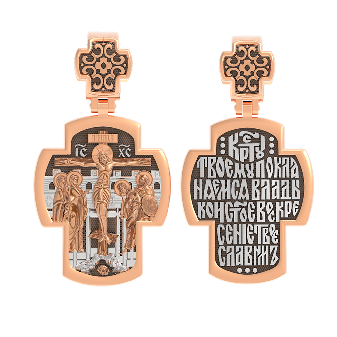 На лицевой стороне креста изображено Распятие Господа и Спасителя нашего Иисуса Христа. Своими крестными страданиями Господь смыл наши грехи, покрыл наш долг перед Богом или, на языке Писания, нас «искупил». В Голгофе сокрыта непостижимая тайна бесконечной правды и любви Бога. Крест стал символом победы добра над злом, жизни над смертью, напоминанием бесконечной Божьей любви, предметом радости. Воплотившийся Сын Божий Своею кровью освятил крест и сделал его проводником Своей благодати, источником освящения верующих. На верхней табличке, выше головы Иисуса, расположена надпись, составленная Понтием Пилатом — «IНЦI». Она означает «Иисус Назорей, Царь Иудейский». Ниже перекладины написано сокращенно имя Спасителя «IC» «XC» — Иисус Христос. Крест стоит на горе камней, символизирующих Голгофу. Под подножием Креста изображена покоящаяся голова (череп) Адама. Слева от Распятия стоят оплакивающие Господа Пресвятая Богородица и святая мироносица Мария Клеопова. Справа — апостол и евангелист Иоанн Богослов, один из ближайших учеников Иисуса Христа и сотник Лонгин. По преданию, увидя, что они горько плачут, Иисус сказал Матери Своей: «Жено! Се сын Твой!» Потом сказал ученику Иоанну: «Се мати твоя». С этого времени Иоанн взял Матерь Божию к себе, и Она жила в его доме до самой смерти.
