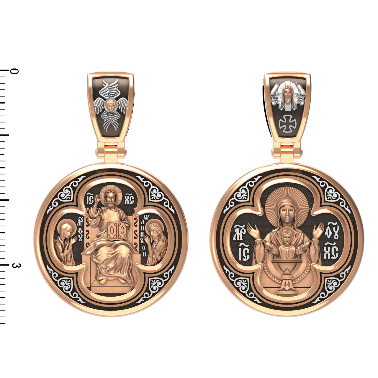 На лицевой стороне образка изображена икона Иисуса Христа Деисус. Он представлен в образе Господа Вседержителя, восседающего на престоле. В его руках — Книга Судеб всего человечества. С двух сторон ему предстоят Пресвятая Богородица и пророк Иоанн Предтеча, Креститель Господень.