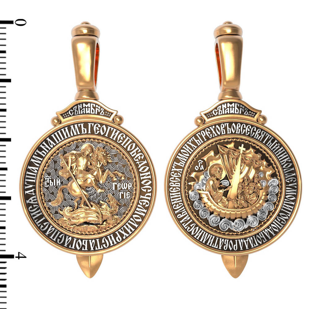 Основой композиции лицевой стороны является изображение Святого Георгия Победоносца. Святой Георгий один из наиболее почитаемых святых в Христианской Церкви. На Руси он известен как Юрий или Егорий, покровитель воинов, помощник в крестьянском труде. На образке изображено самое знаменитое чудо святого: спасение принцессы от змея, которому она предназначалась в жертву. Чудо это имеет символическое толкование. Принцесса означает душу человеческую, а змей — дьявола, желающего ее поглотить. Святой Георгий, небесный защитник, спускается с Небес, чтобы помочь душе избавиться от гибели. По контуру образка написана молитва: «Геогрие Победоносче, моли Христа Бога спастися душам нашим».