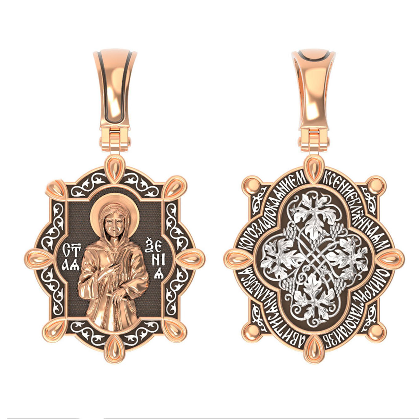На оборотной стороне изображена виноградная лоза — символы церкви и евхаристии. «Я есмь лоза, — говорил Иисус Христос Своим ученикам, — а вы ветви; кто пребывает во Мне, и Я в нем, тот приносит много плода» (Ин. 15, 5), «Я есмь истинная виноградная лоза, а Отец Мой — виноградарь». Вокруг образка написана молитва: «Ксение блаженная, моли Христа Бога избавитися нам от всякаго зла покаянием».