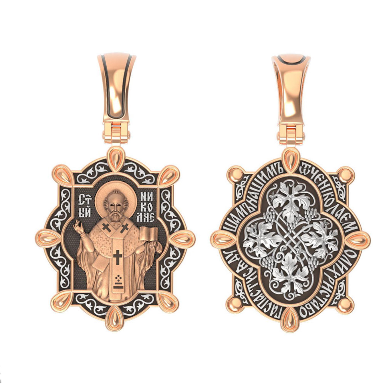 На лицевой стороне образка изображен Святитель Николай архиепископ Мир Ликийских, Чудотворец. Он является одним из самых почитаемых святых в православном мире. Святитель Николай родился во второй половине III века в Малой Азии в Ликийском городе Патары. Сохранилось Предание, что во время крещения он простоял в купели три часа. С детства Святитель избегал развлечений, любил молитву, прекрасно учился и проводил свободное время за чтением Священного писания. Приняв сан священника, святитель Николай стал проводить еще более строгую подвижническую жизнь. Вся жизнь святого Николая — это служение Богу. Он помогал сущим в бедах, укрощал штормы, спасал от потопления и выносил на сушу из глубины морской, освобождал из плена и приносил освобожденных домой, избавлял от темницы, освобождал от смерти, подавал различные исцеления: слепым — прозрение, глухим — слух, немым — дар слова.