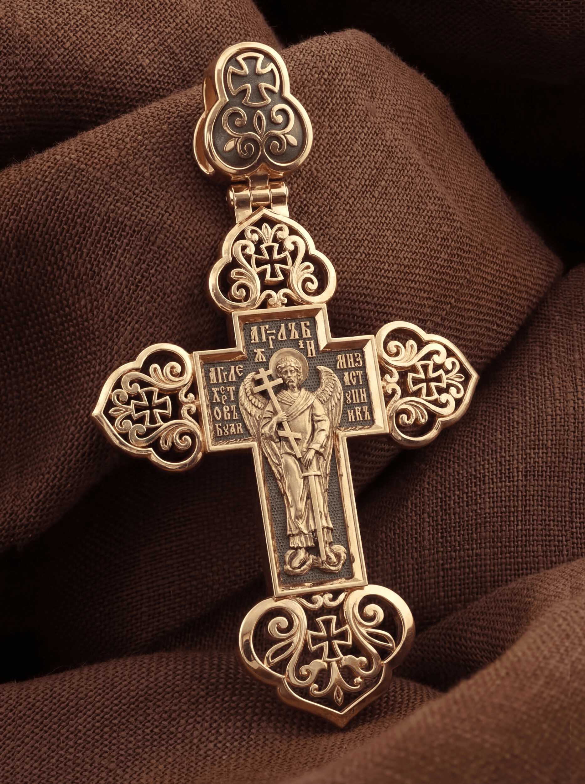 Оборотную сторону креста возглавляет Ангел Хранитель с крестом и мечом: ими он защищает человека от злых духовных и физических нападений. Ангел не может нарушить свободу воли человека, поэтому его надо молитвенно просить о помощи: «Ангеле Христов, буди ми заступник», — эта молитва написана вокруг его образа.