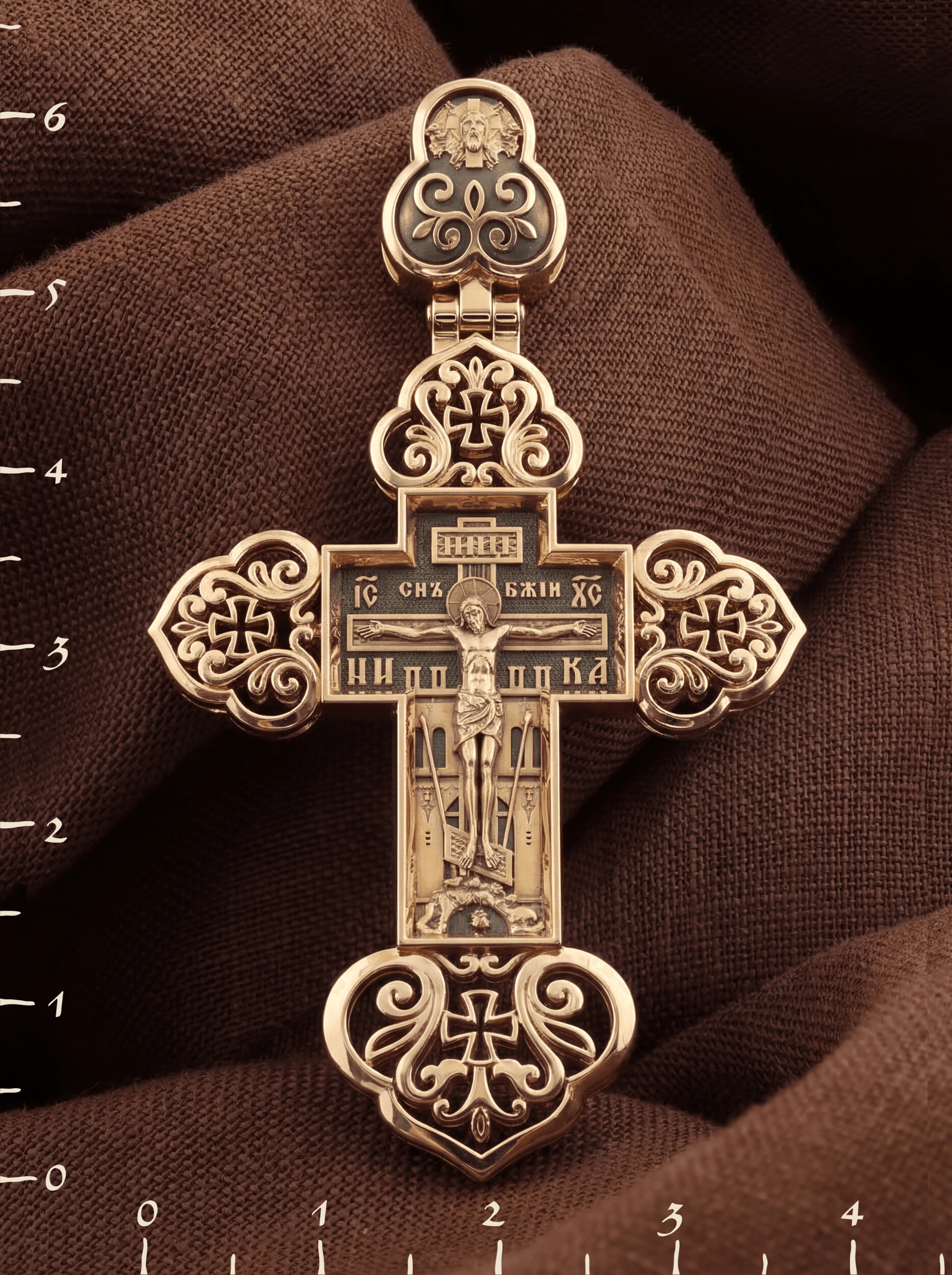 На лицевой стороне изображено Распятие. Позади Распятия видна иерусалимская стена, знак того, что Господь был распят вне стен города. Но вместе с тем стена символизирует и Небесный Иерусалим, путь который открылся для человека через Голгофу. У подножья Господа в виде скалистой горки видна сама Голгофа с Главой Адамовой в пещере. Рядом с Крестом из горы выступают орудия страданий Господа — трость и копие, обозначенные буквами Т и К. На трости стражники подали Христу пропитанную уксусом губку, когда Он жаждал воды, а копьем пронзили Ему ребра, чтобы проверить: умер ли Он?