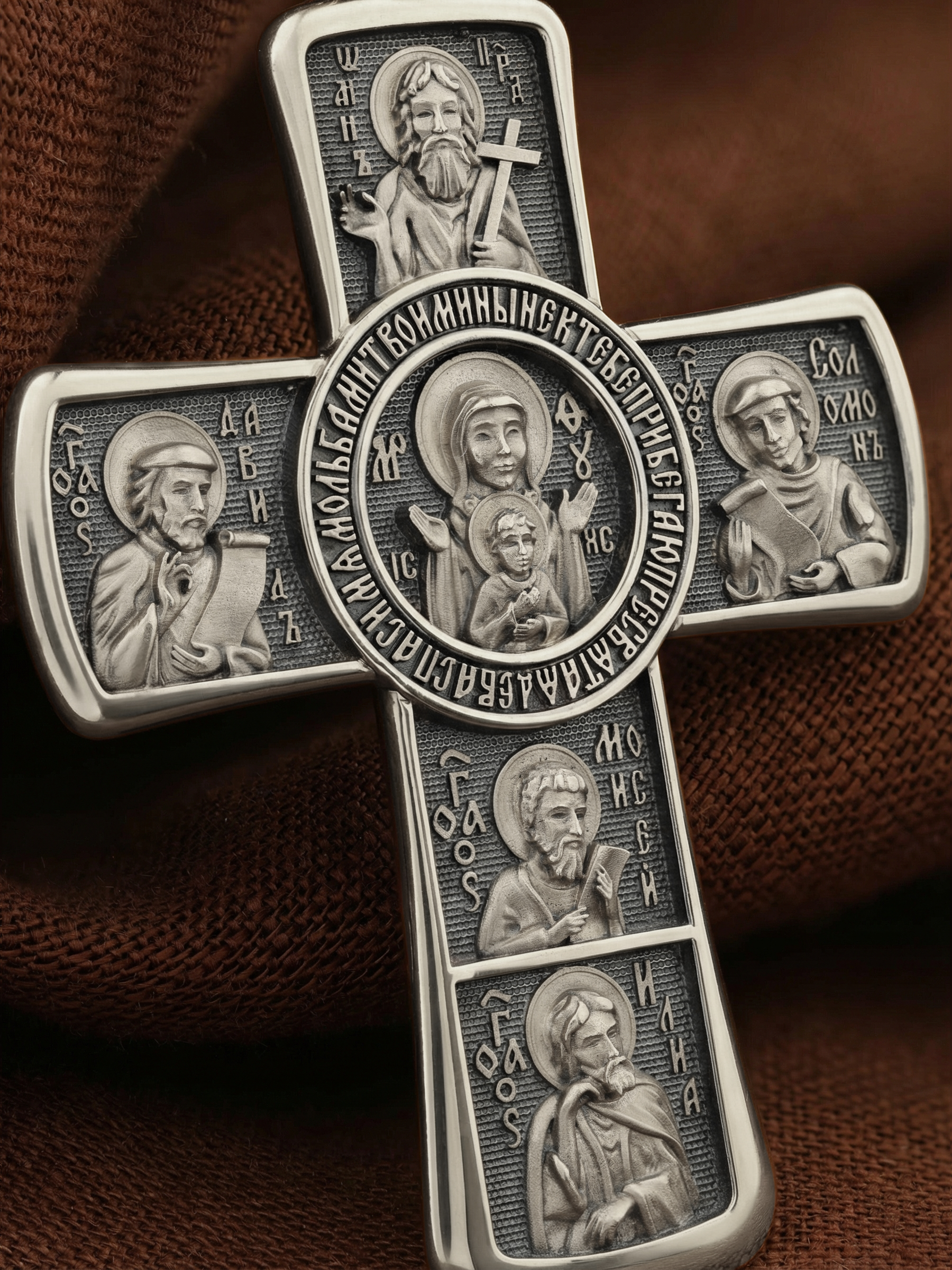 Центральную часть оборота креста украшает икона Божией Матери «Знамение». Вокруг Ее образа написана молитва: «Ныне к Тебе прибегаю, Пресвятая Дева, спаси мя мольбами Твоими».