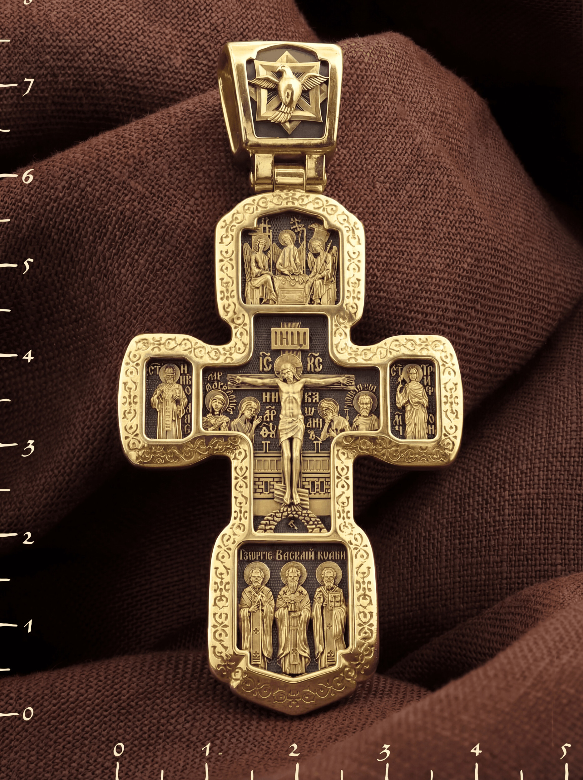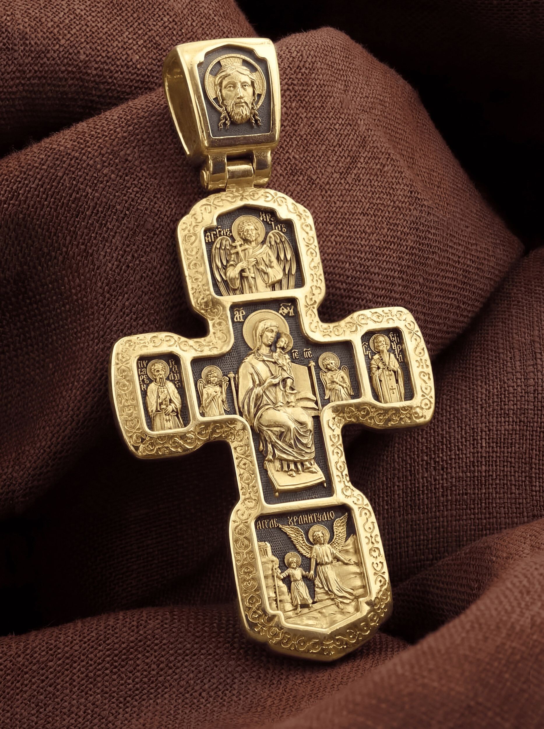 Внизу изображены три святителя, творцы Божественной Литургии. В центре — святой Василий Великий, справа — святой Иоанн Златоуст, а слева — святой Григорий Богослов. В центральной части оборотной стороны Креста изображена икона Божией Матери «Всецарица» или «Пантанасса». Чудотворная икона была написана в XVII веке и находится на Святой Горе Афон. Икона совершила множество чудесных исцелений. Пречистая Богородица наставляет на праведный путь, помогает укрепить веру, найти утешение. По бокам изображены прп. Сергий Радонежский и святитель Спиридон Триумфунский. Сверху и снизу помещены изображения Ангела-Хранителя. На кулонном кольце помещено изображение Спаса Нерукотворного. Ему придается победное и защитное значение.