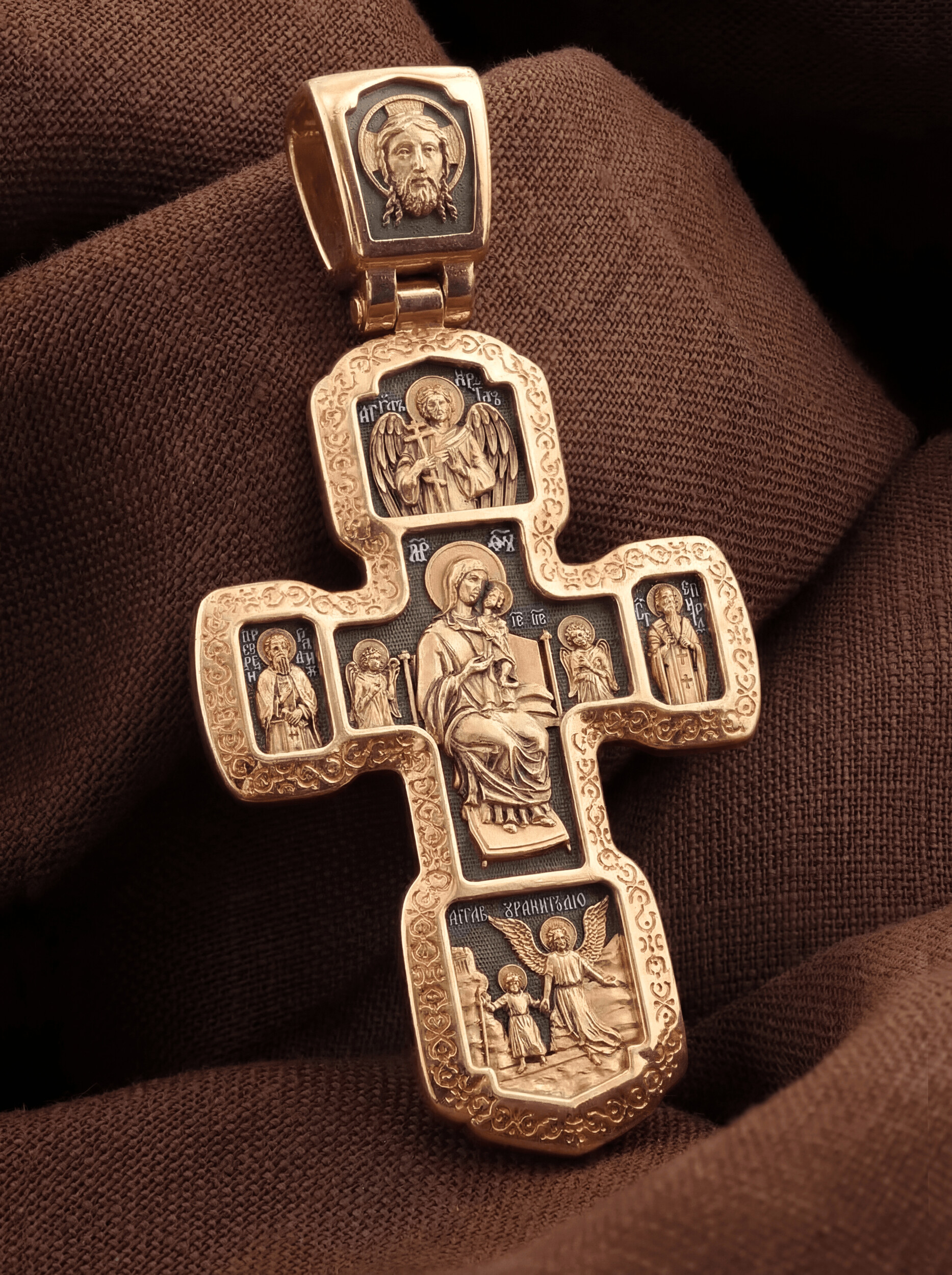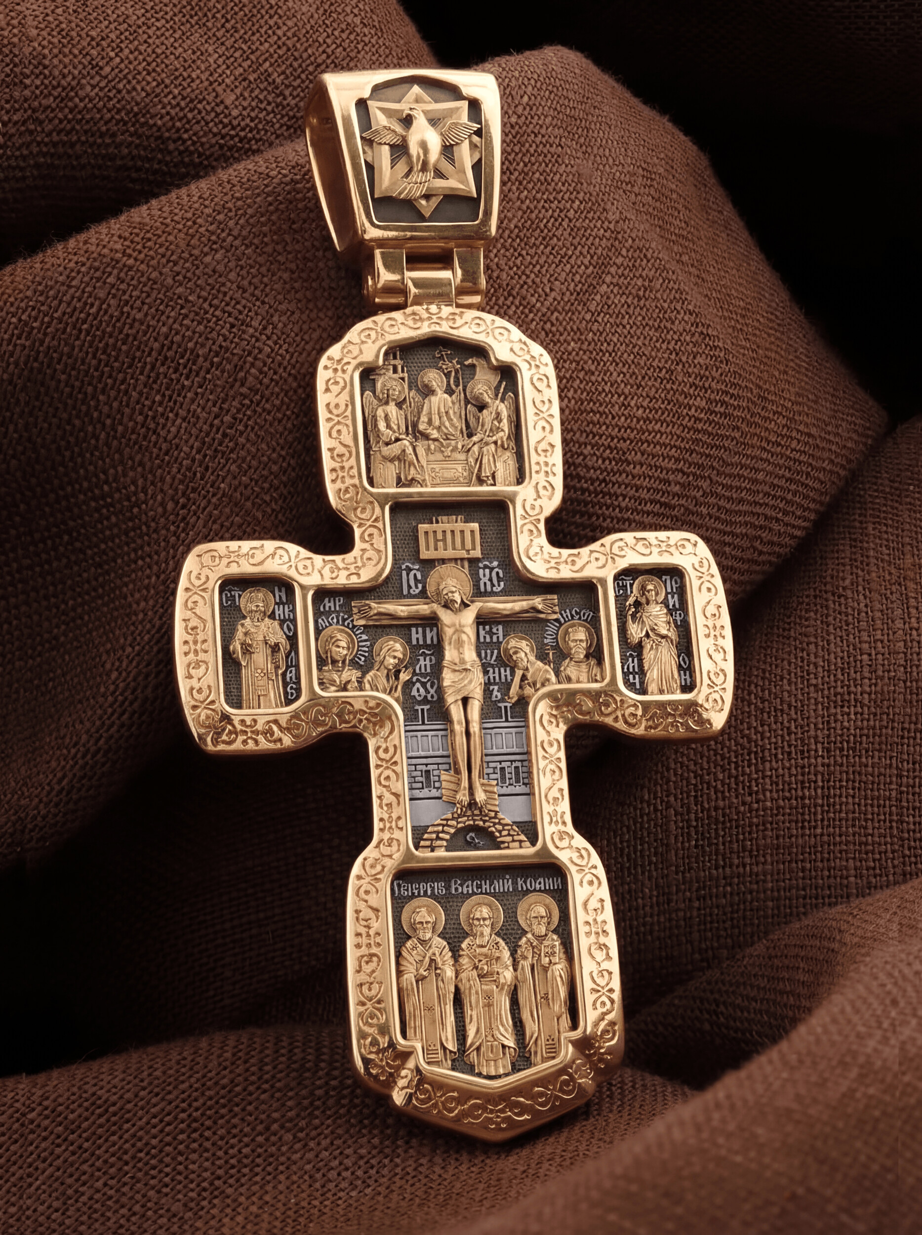 Внизу изображены три святителя, творцы Божественной Литургии. В центре — святой Василий Великий, справа — святой Иоанн Златоуст, а слева — святой Григорий Богослов. В центральной части оборотной стороны Креста изображена икона Божией Матери «Всецарица» или «Пантанасса». Чудотворная икона была написана в XVII веке и находится на Святой Горе Афон. Икона совершила множество чудесных исцелений. Пречистая Богородица наставляет на праведный путь, помогает укрепить веру, найти утешение. По бокам изображены прп. Сергий Радонежский и святитель Спиридон Триумфунский. Сверху и снизу помещены изображения Ангела-Хранителя. На кулонном кольце помещено изображение Спаса Нерукотворного. Ему придается победное и защитное значение.
