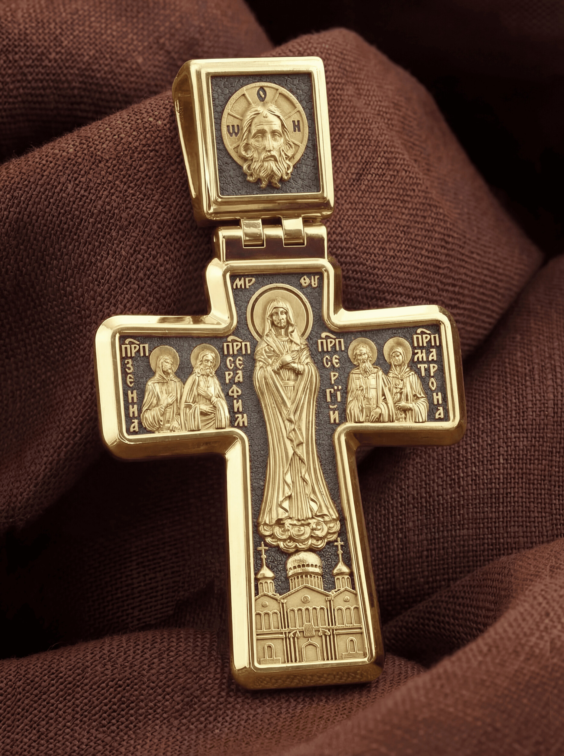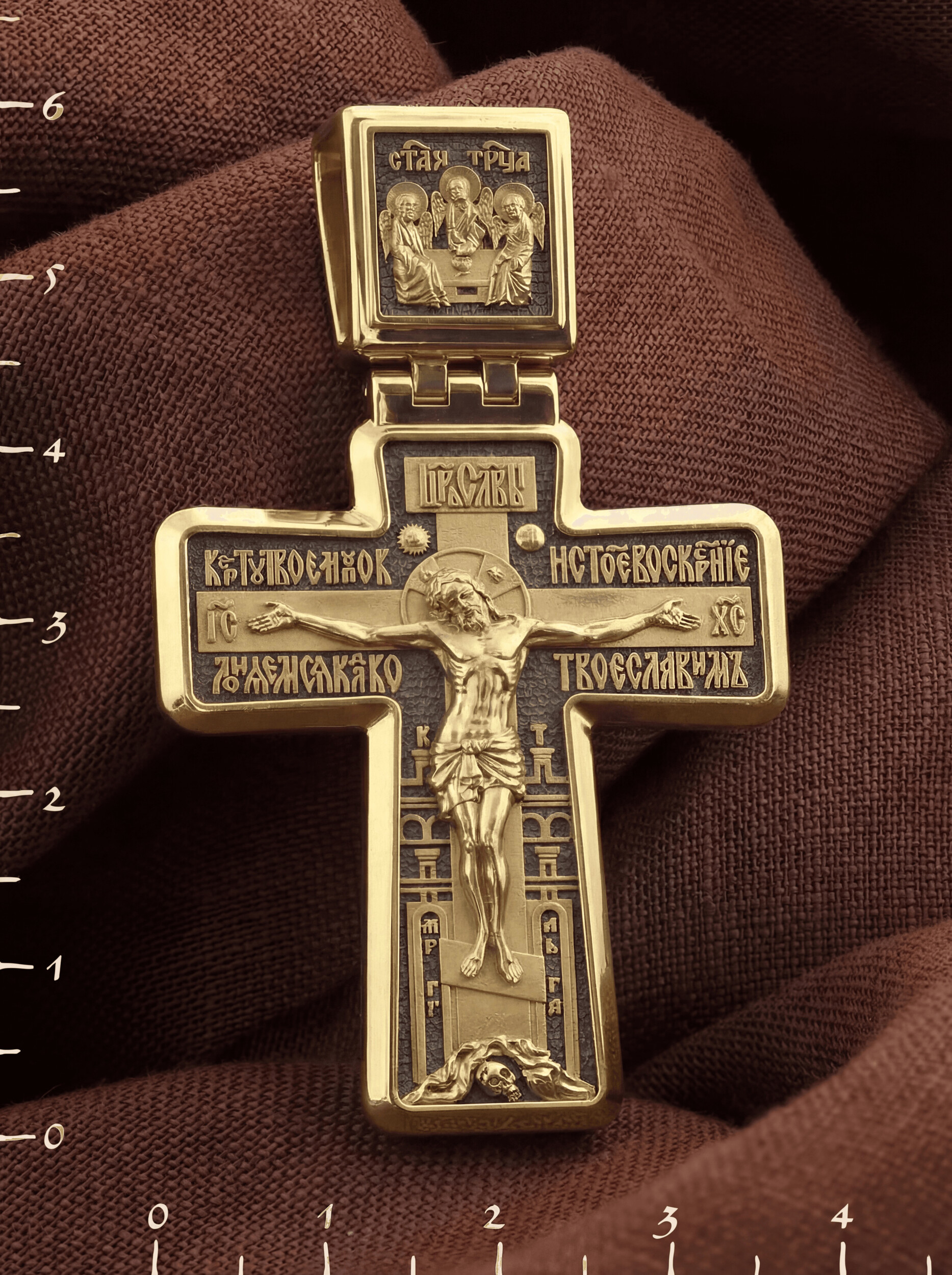 На лицевой стороне креста изображено Распятие Иисуса Христа. Позади Его изображена иерусалимская стена, знак того, что Господь был распят вне стен города. Но вместе с тем стена знаменует и Небесный Иерусалим, путь в который открылся для человечества через Голгофу: «МЛРБ», «Место Лобное Рай Бысть» — написано у ее основания. Рядом с Его образом помещены слова «Царь Славы». Эти слова характеризуют Господа как Великого Архиерея, победителя смерти. Верхняя перекладина символизирует титло — табличку, на которой, согласно Евангелию, было начертано: «Иисус Назорей Царь Иудейский» (IНЦI). Также Распятие сопровождается надписями, олицетворяющими Христа. Это святое имя Христа «IC» (Иисус) «ХС» (Христос), и словосочетание «Сын Божий», а так же написан тропарь Животворящему Кресту: «Кресту Твоему поклоняемся, Владыко, и святое воскресение Твое славим». Распятие стоит на горе камней, символизирующих Голгофу, в основании которой различается череп. Это голова Адама. На кулонном кольце помещено изображение Святой Троицы.