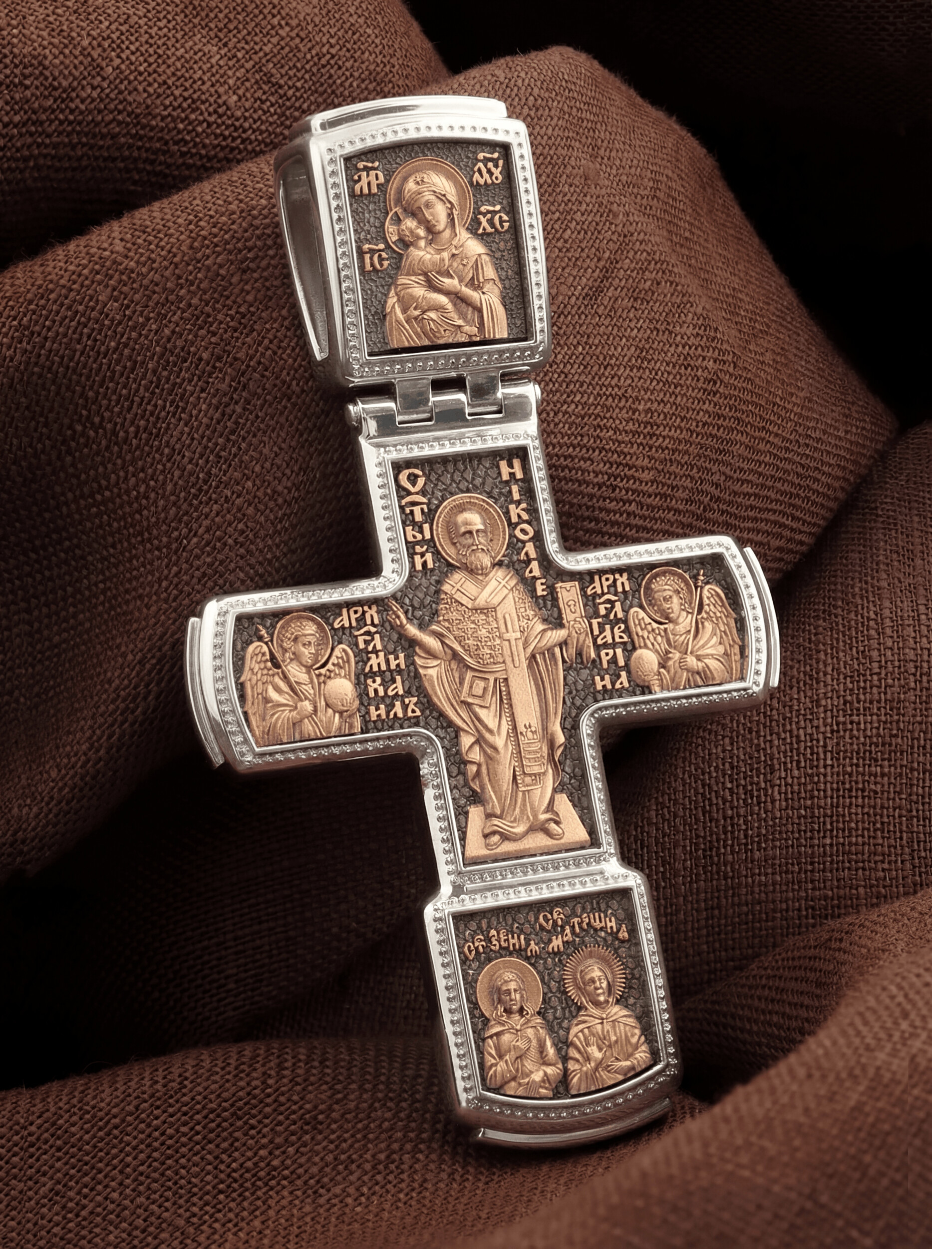 В центре на обороте — самый почитаемый в Православной Церкви святой, Николай Чудотворец, которого еще называют Николай Угодник за то, что он угодил своей жизнью Богу. Ему молятся, отправляясь в путешествие, особенно по морю, просят исцеления в различных недугах, помощи в торговых делах, учебе и поисках достойного супруга. С двух сторон от Николая Чудотворца помещены образы архангелов Михаила и Гавриила. Вверху — Владимирская икона Божией Матери — самая великая русская святыня, многие века бывшая олицетворением нашей земли. Перед ней венчались на царство государи, избирались патриархи. Пречистой Богородице Владимирской клялись в верности Отечеству солдаты и за нее умирали на поле брани. Именно на ее защиту более всего уповала Россия в самые страшные периоды своей истории. В нижнем клейме — иконы двух святых помощниц от всех недугов, блаженных Ксении Петербургской и Матроны Московской.