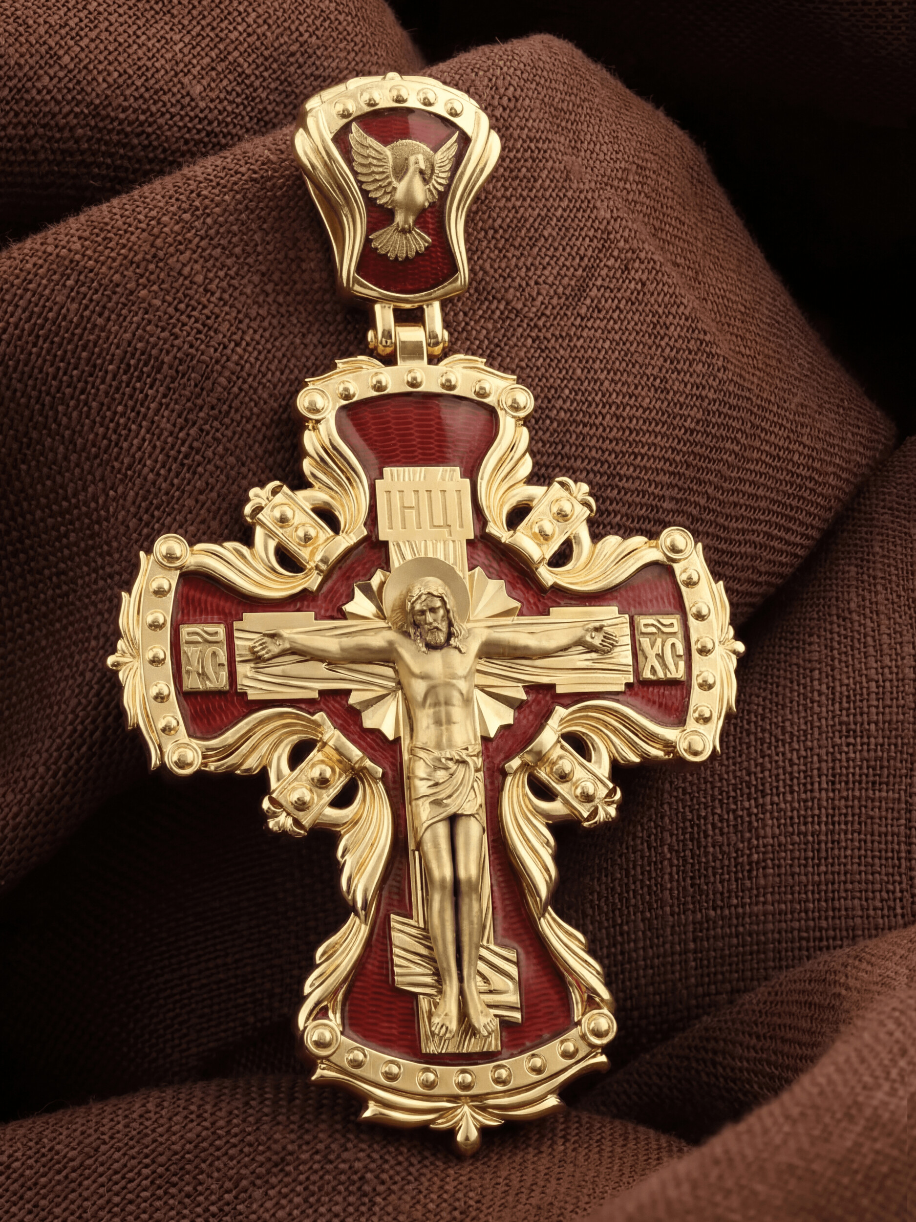 Центральную часть лицевой стороны занимает Распятие Христа — образ жертвы, принесенной Господом за грехи людей. Именно ко Христу, сошедшему на землю ради нашего спасения, возносятся все молитвы. Рядом с Его образом помещены слова — «НИКА» и «СЫН БОЖИЙ». Эти слова характеризуют Господа как Великого Архиерея, победителя смерти. Также Распятие сопровождается надписями, олицетворяющими Христа — это святое имя Христа «IC» (Иисус) «ХС» (Христос). На кулонном кольце изображен голуь — символ Святого Духа.