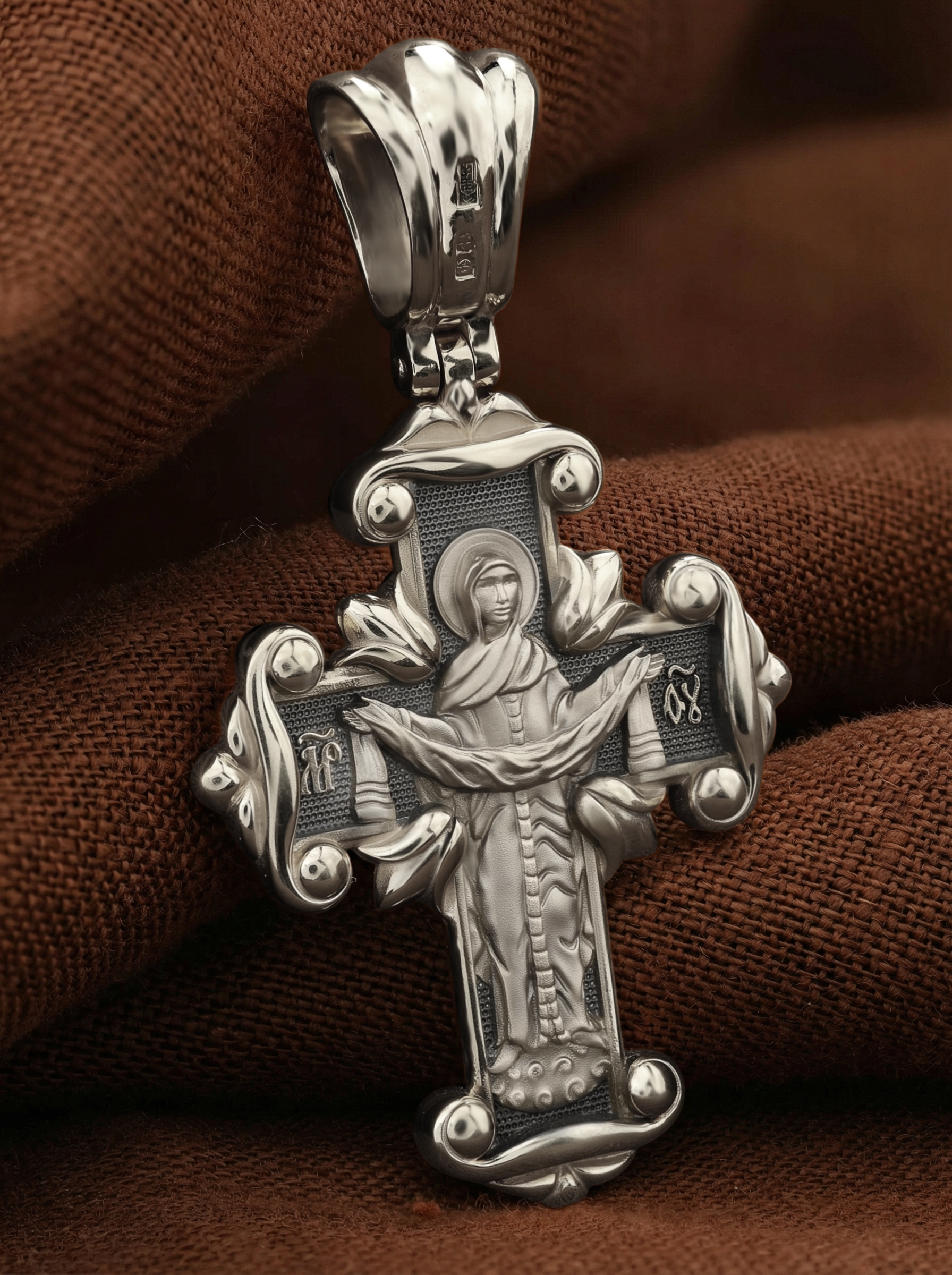 На оборотной стороне креста изображена икона Божией Матери «Покров Пресвятой Богородицы». Праздник Покрова Пресвятой Богородицы пришел на Русь в XII веке из Византии и стал одним из самых почитаемых. В 910 году Византийской Империи угрожали нападением сарацины. Не видя ниоткуда помощи, в те дни греки во множестве стекались в Константинополь, во Влахернский храм, в котором хранились риза Богоматери и Ее головной покров, и молились. 1 (14) октября 910 года Святому Андрею Юродивому и его ученику Епифанию было видение Покрова Божией Матери. Пресвятая Богородица, в окружении Святых, явилась над алтарем Храма и слезно молилась. По окончании молитвы сняла с Себя блистающее великое и страшное покрывало, которое носила на Пречистой главе Своей и, держа его с великой торжественностью, распростерла над всем стоящим народом. Вскоре враги без всякого кровопролития отступили от города. Богородица простирает Свой молитвенный покров над всеми православными христианами и умоляет Сына своего о даровании вечного спасения каждому человеку.